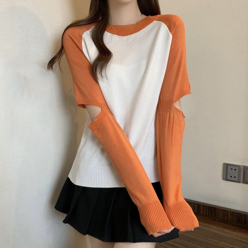 ラウンドネック 韓国風ニットウェア バイカラー レディース ニットプルオーバー 重ね着 通勤通学ニットソー カジュアル
