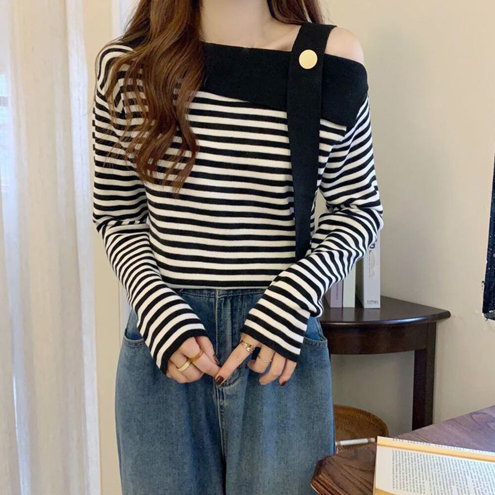 【日本倉庫即納】 ワンショルダー ボーダー柄ニットトップス