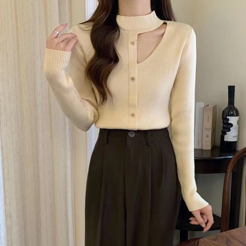 ニットウェア フロントオープン ニットプルオーバー スリムフィット ニットソー カジュアル 長袖トップス お洒落 着回し