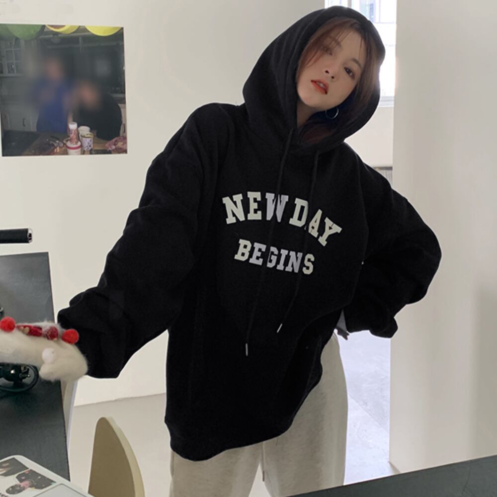 長袖ロゴパーカー黒 裏フリーストップス ゆるシルエット韓国