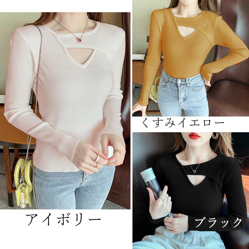 カットソー 着やせ タイト レディース デコルテ開き 重ね着 韓国風 プルオーバー シンプル 肌見せ 穴あき 普段着