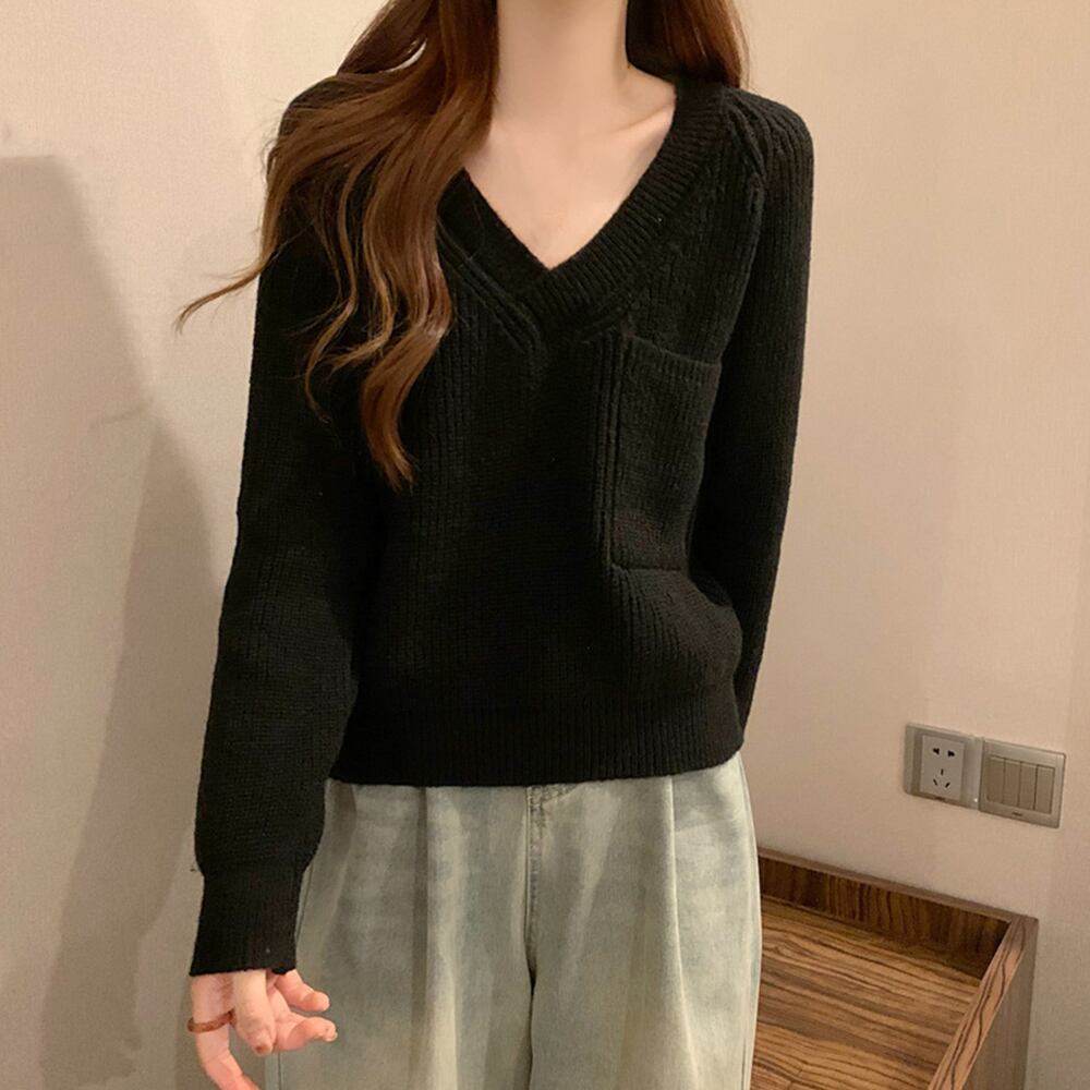 【日本倉庫即納】 Vネックニットトップス 胸ポケット韓国風