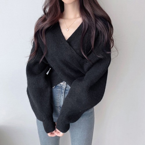 クロスに重なったデザインが主役級なカシュクールニットトップス