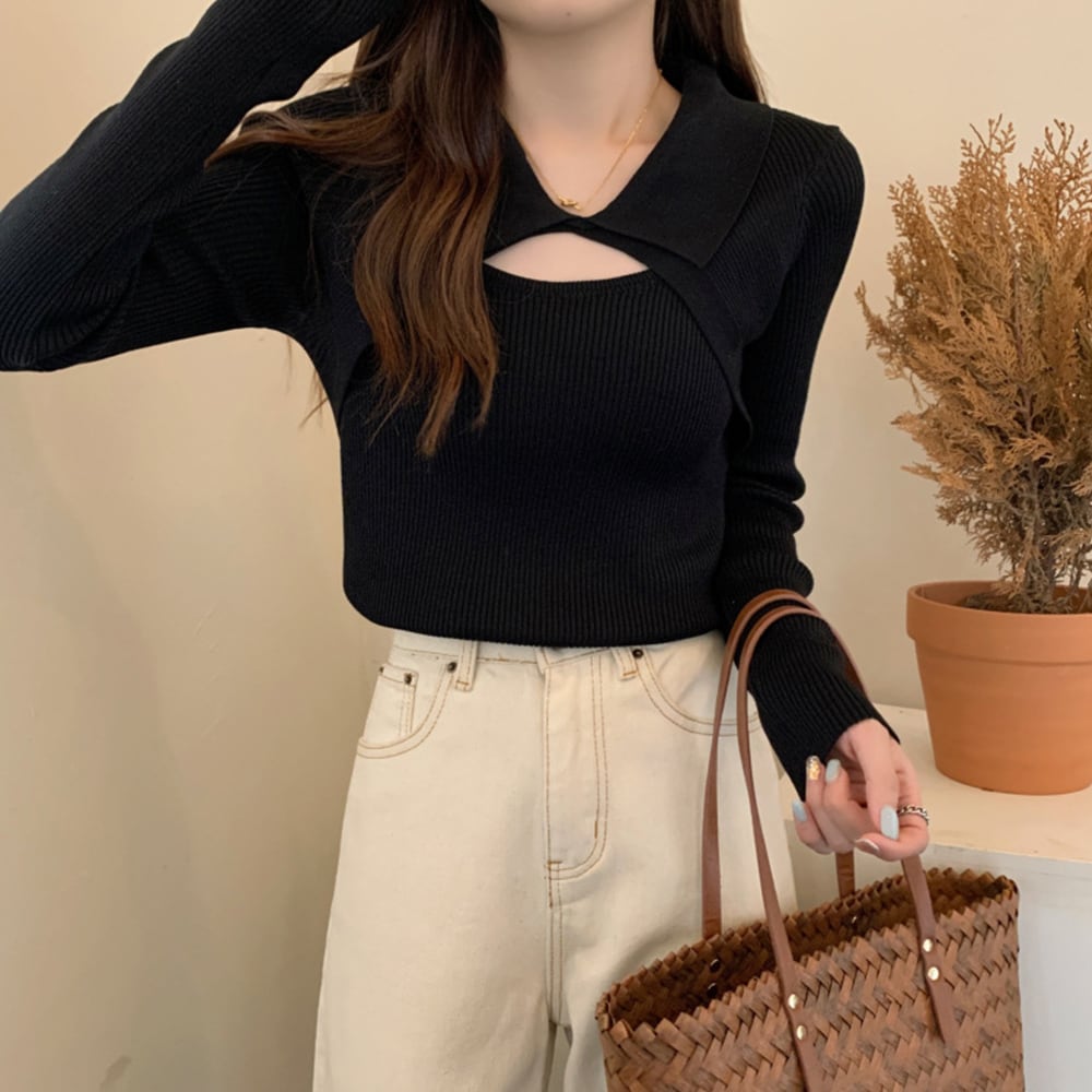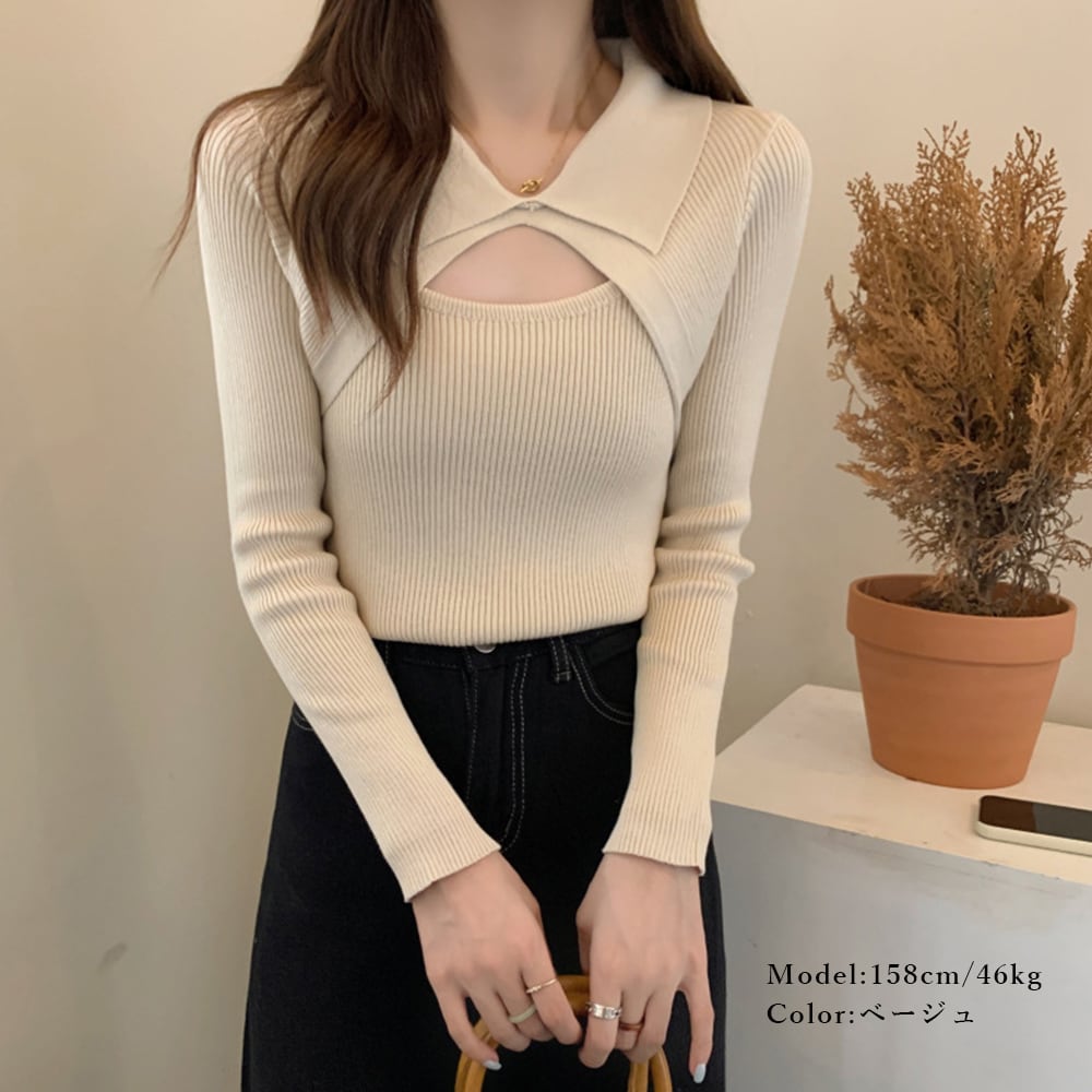 【日本倉庫即納】 カットアウト襟付きニットトップス 肌見せ