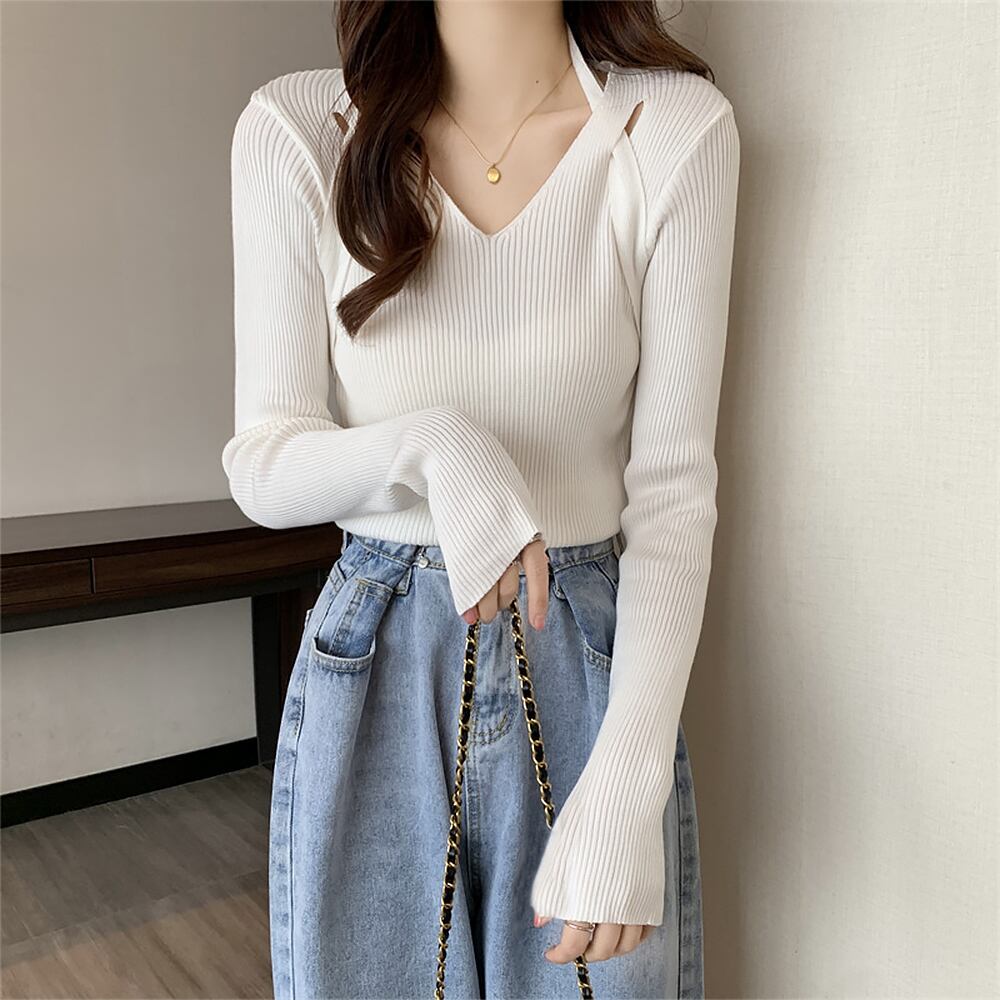 ニットソー 鎖骨見せ ホルターネック 穴あき クロス おしゃれ 着やせ きれいめ セクシー 細見え 肌見せ 大人
