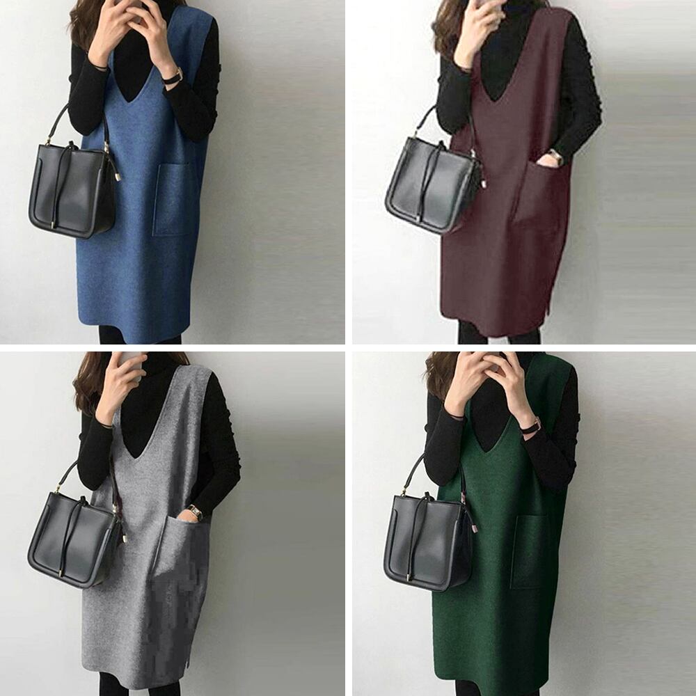 ゆったり無地ベスト 膝丈チュニック通勤 重ね着ベストワンピ