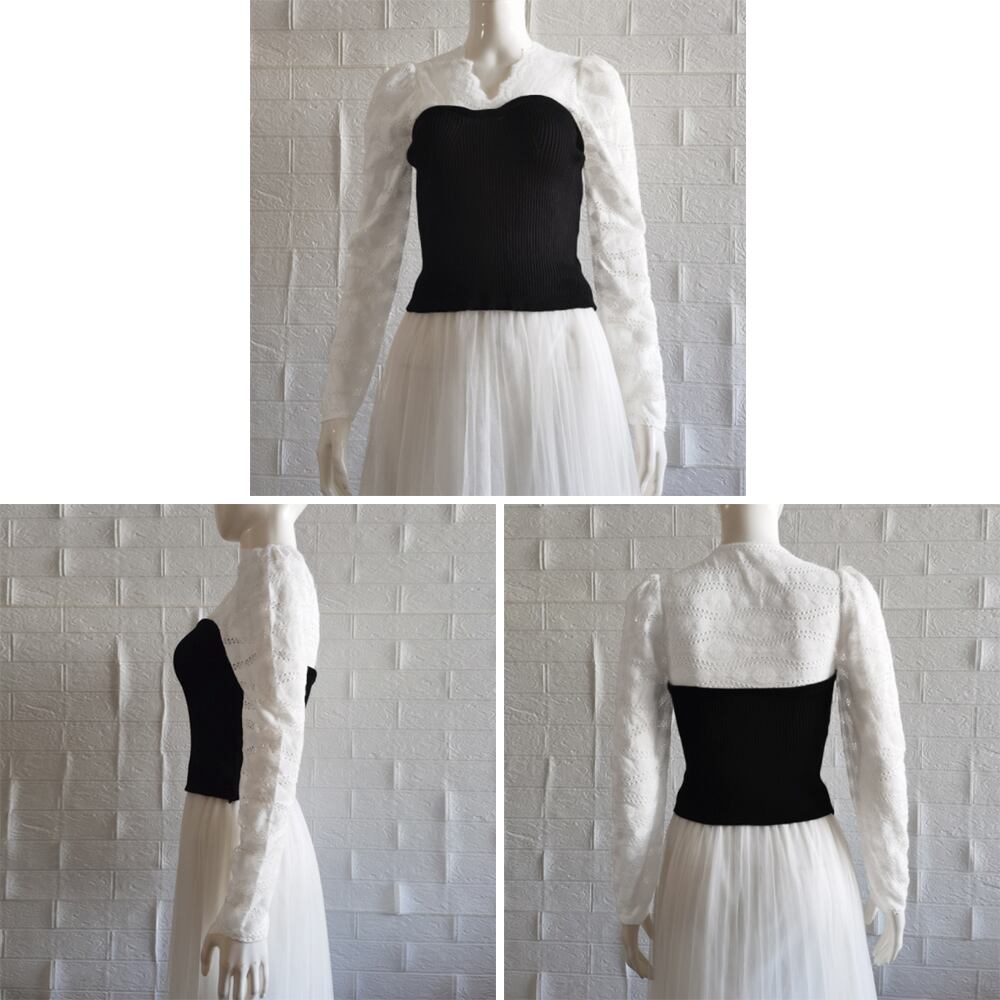 レースの切り替えでデコルテ、袖や背中見せるリブニットトップス