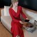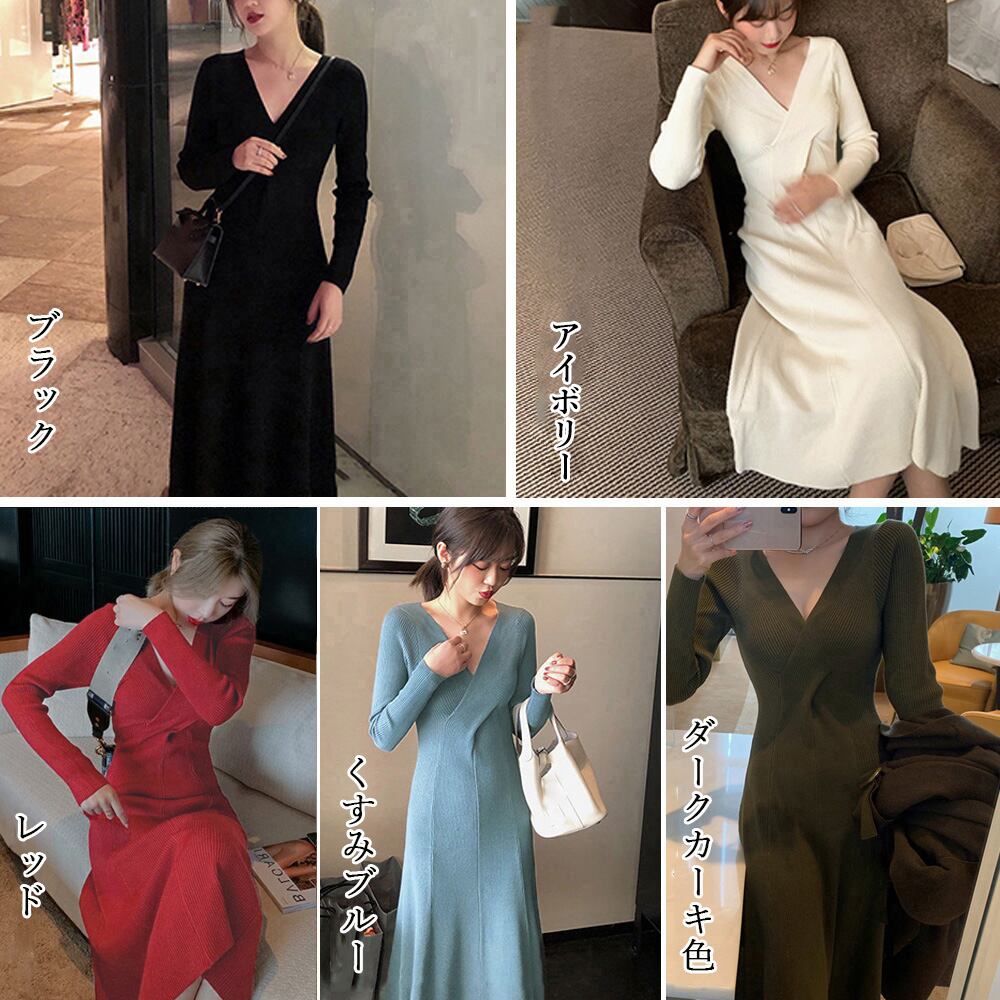 ミモレ丈ワンピース 長袖秋冬 ハイウエスト リブニットドレス フレアワンピ Vネック 韓国風 きれいめ 秋冬服 オフィス