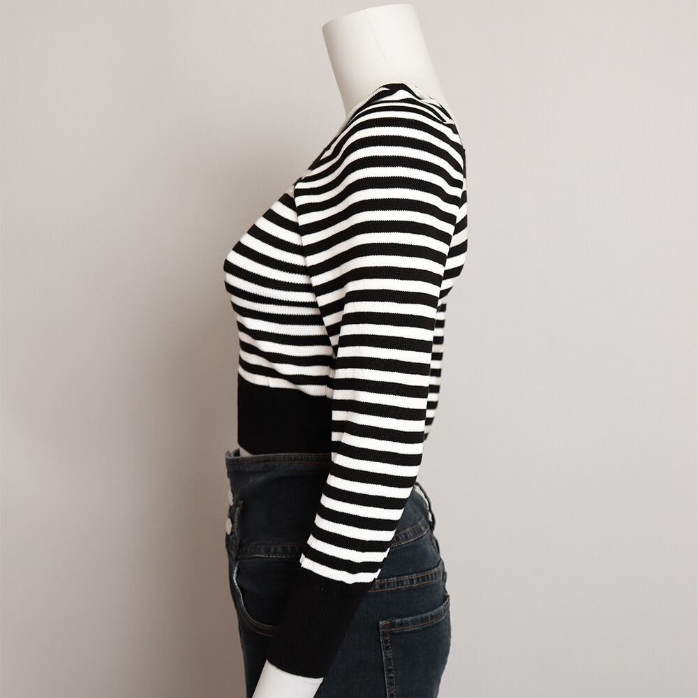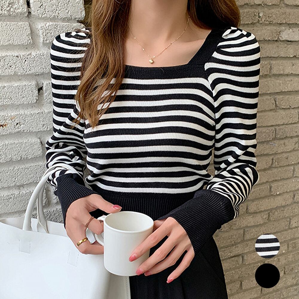 スクエアネック ショート丈 ニットセーター 韓国ファッション ウエア 無地 ボーダー柄 きれいめ カジュアル 春秋冬