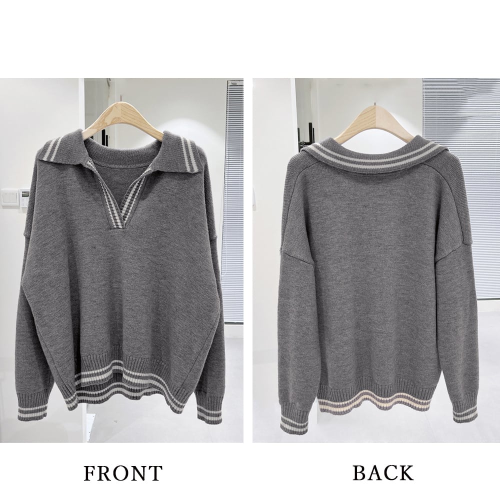 ニットポロシャツ Vネック ニットソー ニットセーター 襟付き バイカラー ニットプルオーバー 長袖 体型カバー 暖かい
