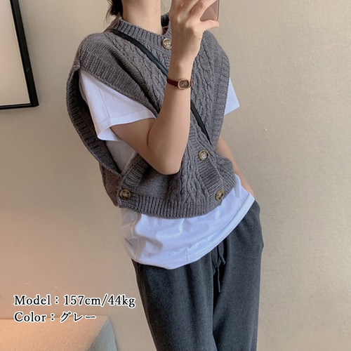 前開き チョッキ トップス フレンチスリーブ レイヤード風 重ね着 お洒落 ケーブルニット きれいめ 体型カバー 無地