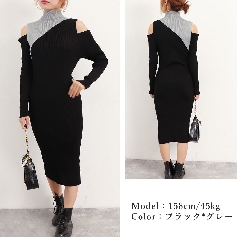 前後2way ニットワンピ リブニット ロングワンピ フェミニン フィット感 秋冬 肌魅せ 大人カジュアルきれいめワンピ