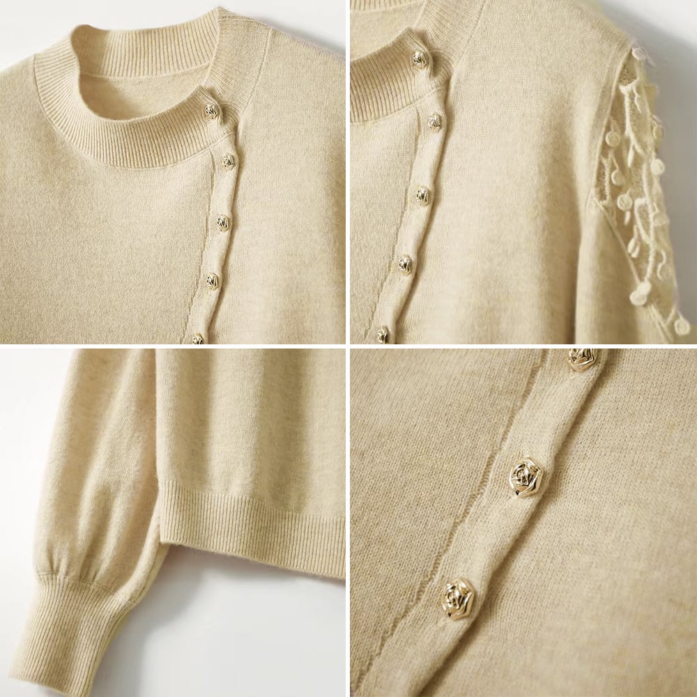 袖口と裾のリブで可愛いシルエットを引き締める、肩部分に肌魅せの透け感がとてもフェミニンで大人女性セクシーな雰囲気に