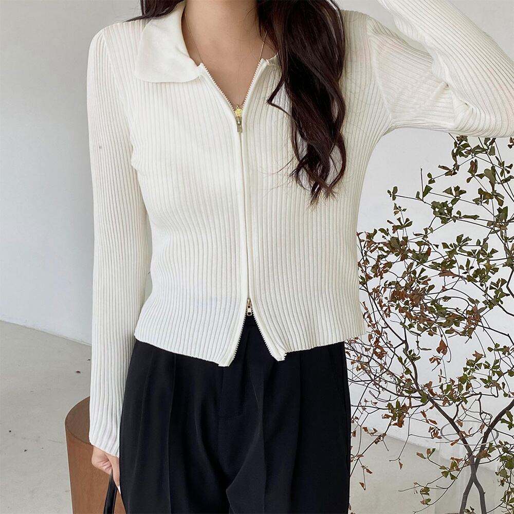 ニットセーター 前開き フィット感 きれいめ フロントZIP ショート丈 Vネック 長袖ニットアウター 無地 オルチャン