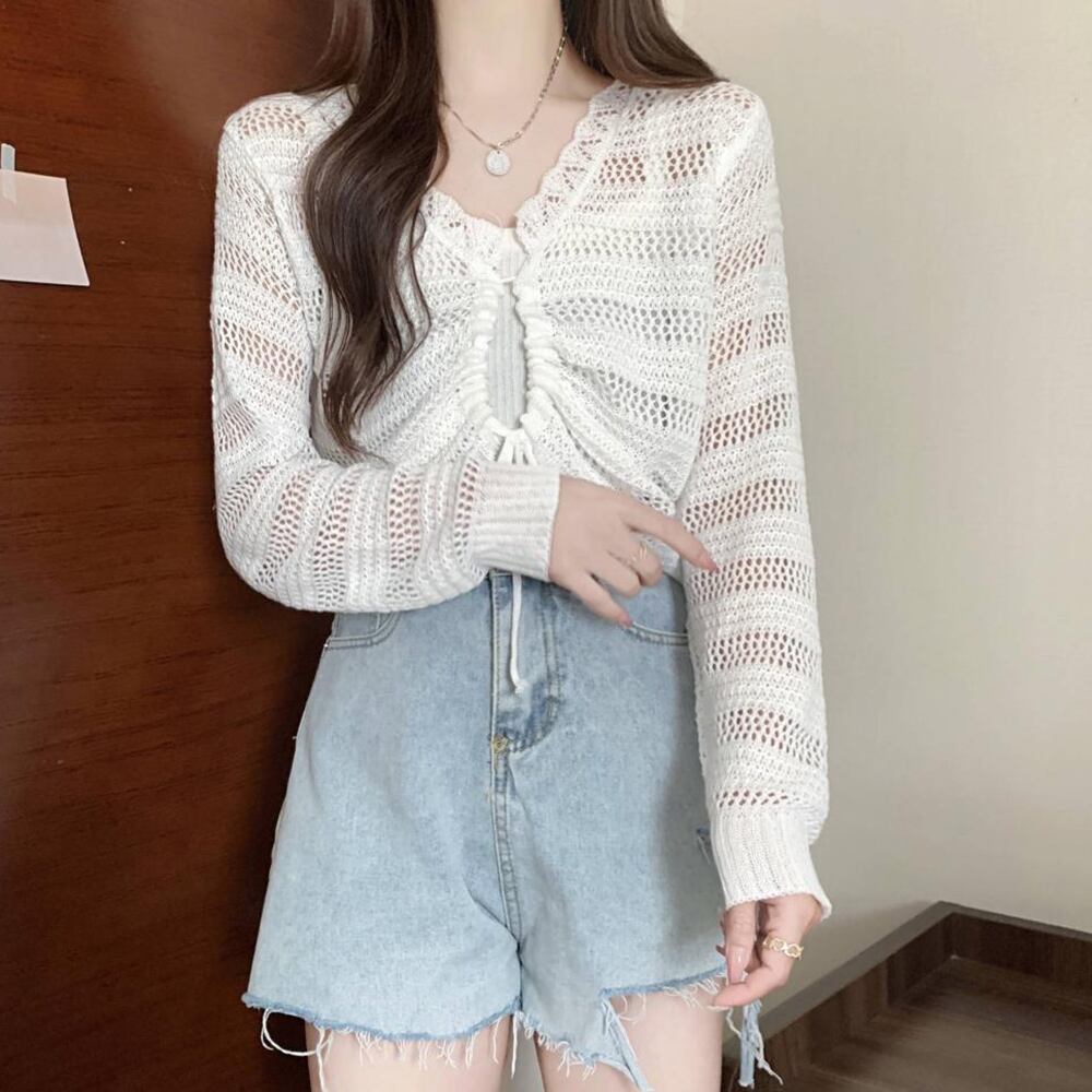 透け感秋服かぎ編み 韓国風 ショート丈 メッシュニット春秋