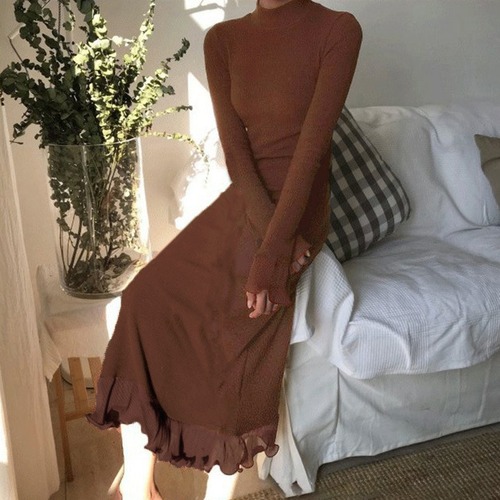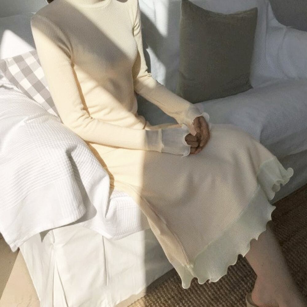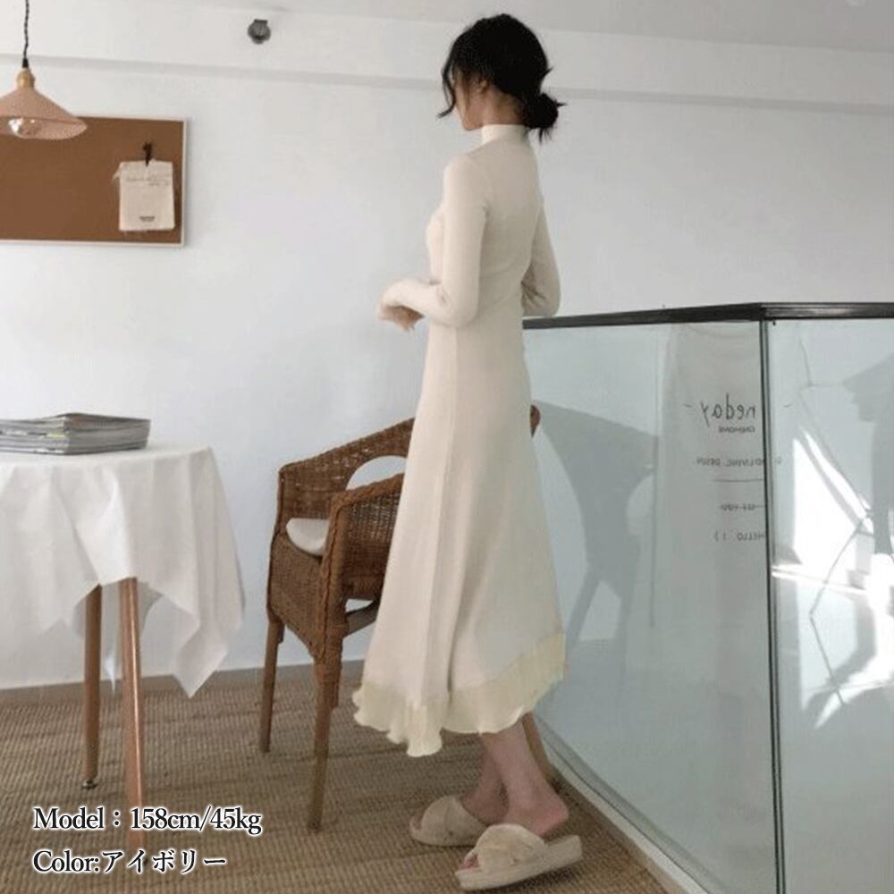 フェミニン無地長袖 ワンピース韓国上品 ボトルネックワンピ