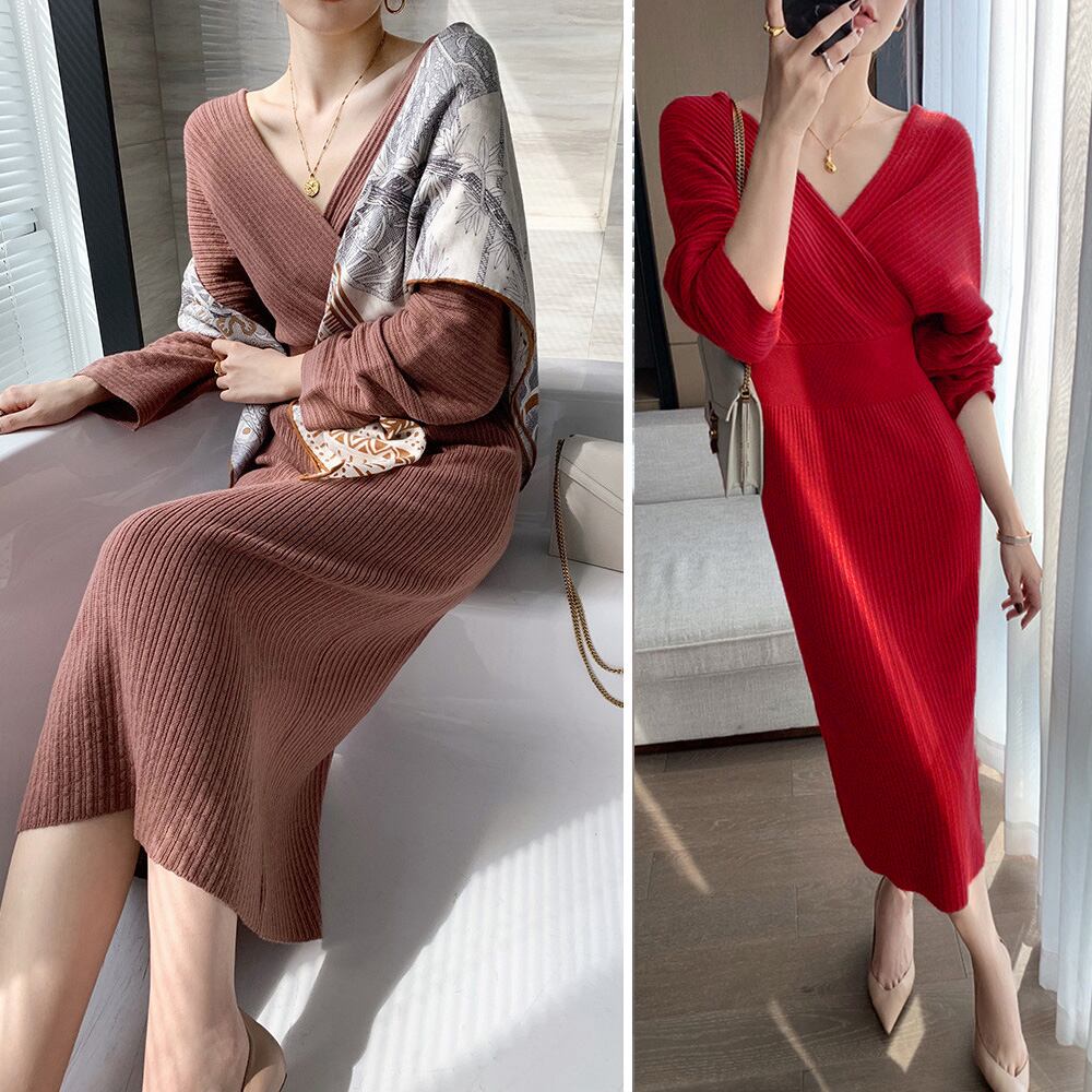 大人可愛い ミモレ丈ワンピース ハイウエスト 前後Vネック タイトワンピース 着やせ フェミニン セーターワンピ 秋冬
