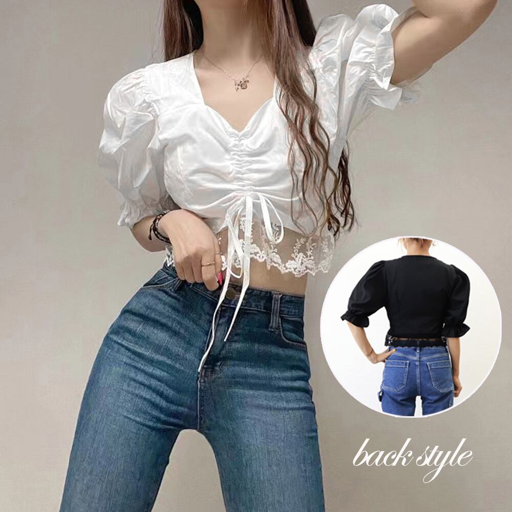 レースアップブラウス ボリューム袖 半袖シャツ レース裾 袖口ゴム トップス 清楚 オルチャン レース切替えトップス 黒