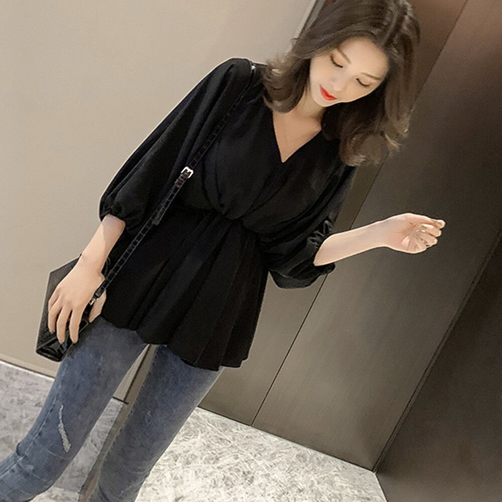レディースブラウス ロング きれいめ ゆったり オフィスカジュアル 韓国風 トップス ウエストマーク 体型カバー ママ服