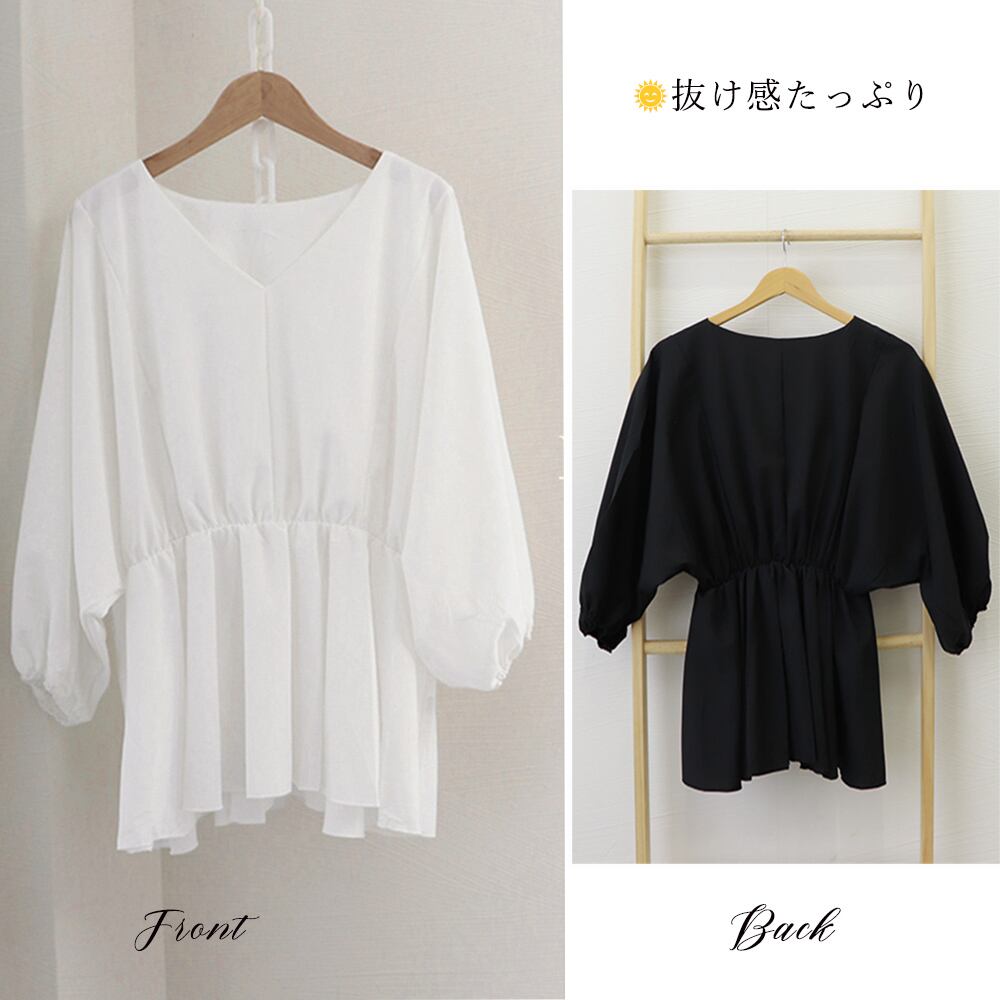 【日本倉庫即納】 Vネックブラウス着やせパフスリーブ 無地