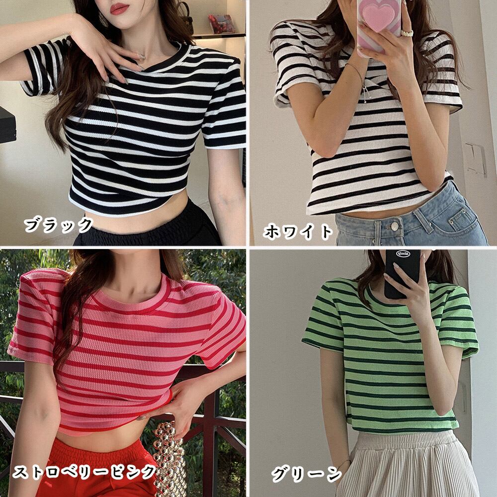 ラウンドネックtシャツ カラーtシャツ クロップド へそ出し 半袖 オルチャンサマートップス 配色ライン 服 ストレッチ