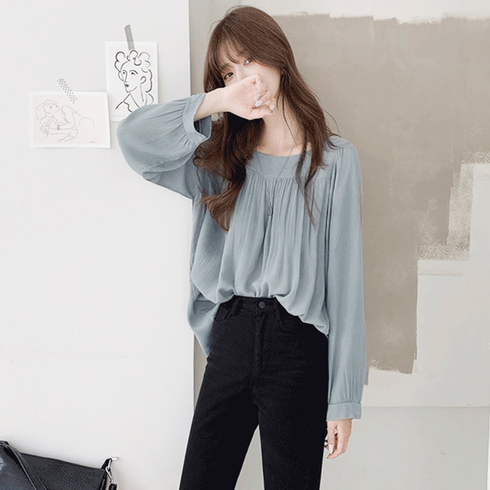 ふんわりとしたシルエットに透け感のあるシフォン素材で仕上げ長袖シャツブラウス