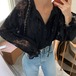 フリル袖ブラウス黒 レーストップス春秋 透かしレースシャツ