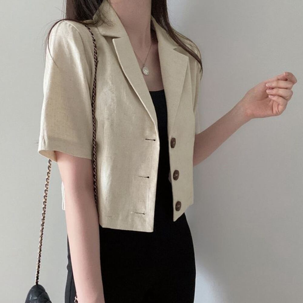 レディース 無地 麻ライク夏 ジャケット ショート丈 サマージャケット オフィスカジュアル 春秋新作 韓国アウター 大人