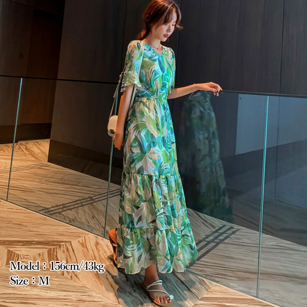 【日本倉庫即納】 花柄 ティアードワンピース春夏 Vネック