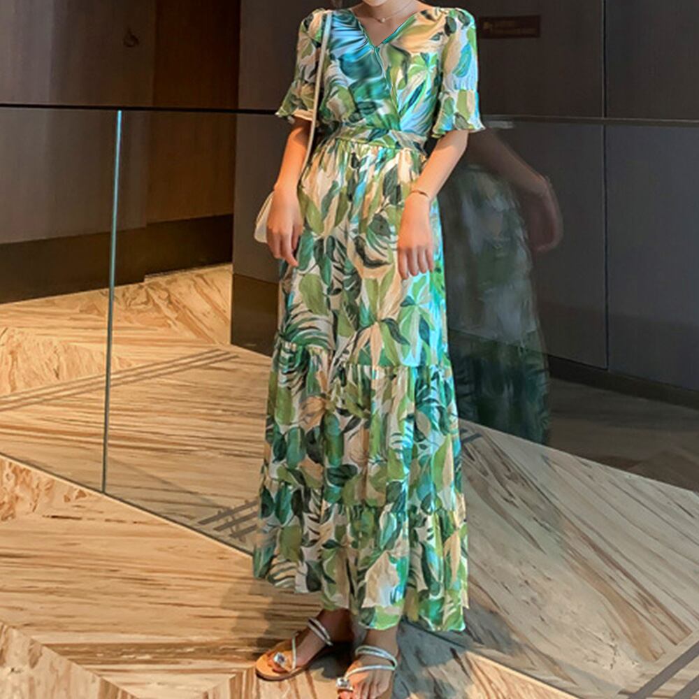 フェミニン カシュクール風 ロングワンピ リゾート ウエストマーク マキシワンピ フレアスリーブ サマーワンピ Aライン