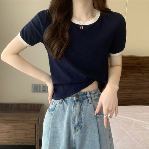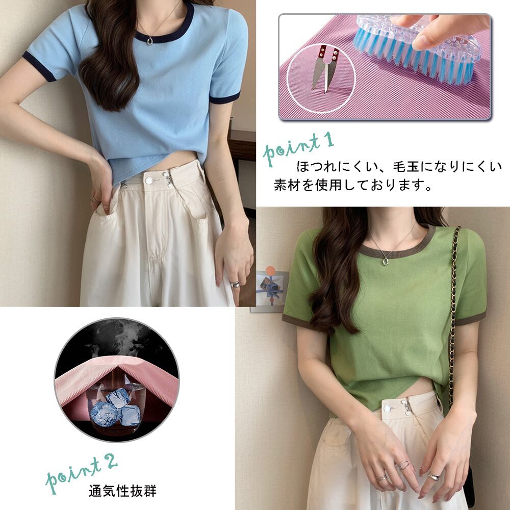 ベーシック 配色 ショート丈トップス クルーネック クロップド丈 ニットtシャツ ラウンドネック無地 ニットソー春秋夏