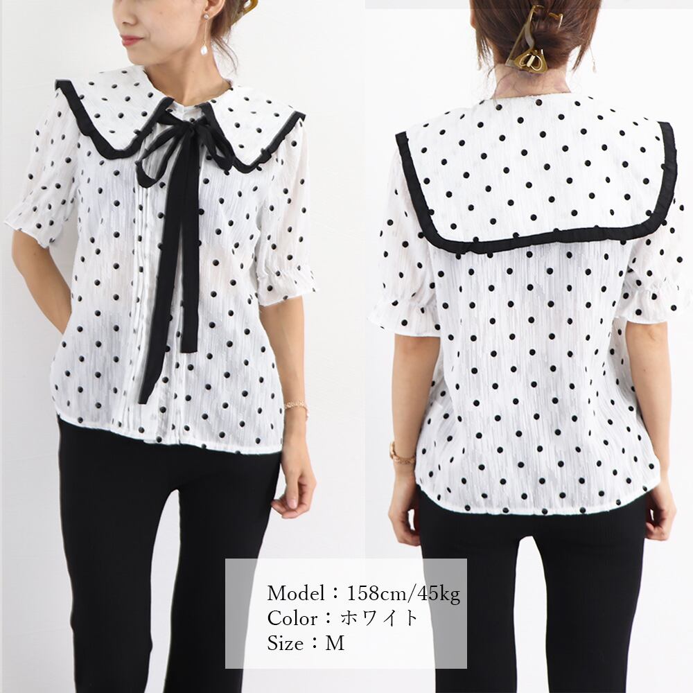 可愛い セーラーカラーブラウス 水玉シャツブラウス 半袖 シフォンブラウス リボンタイブラウス 春夏秋 袖フリルレトロ風
