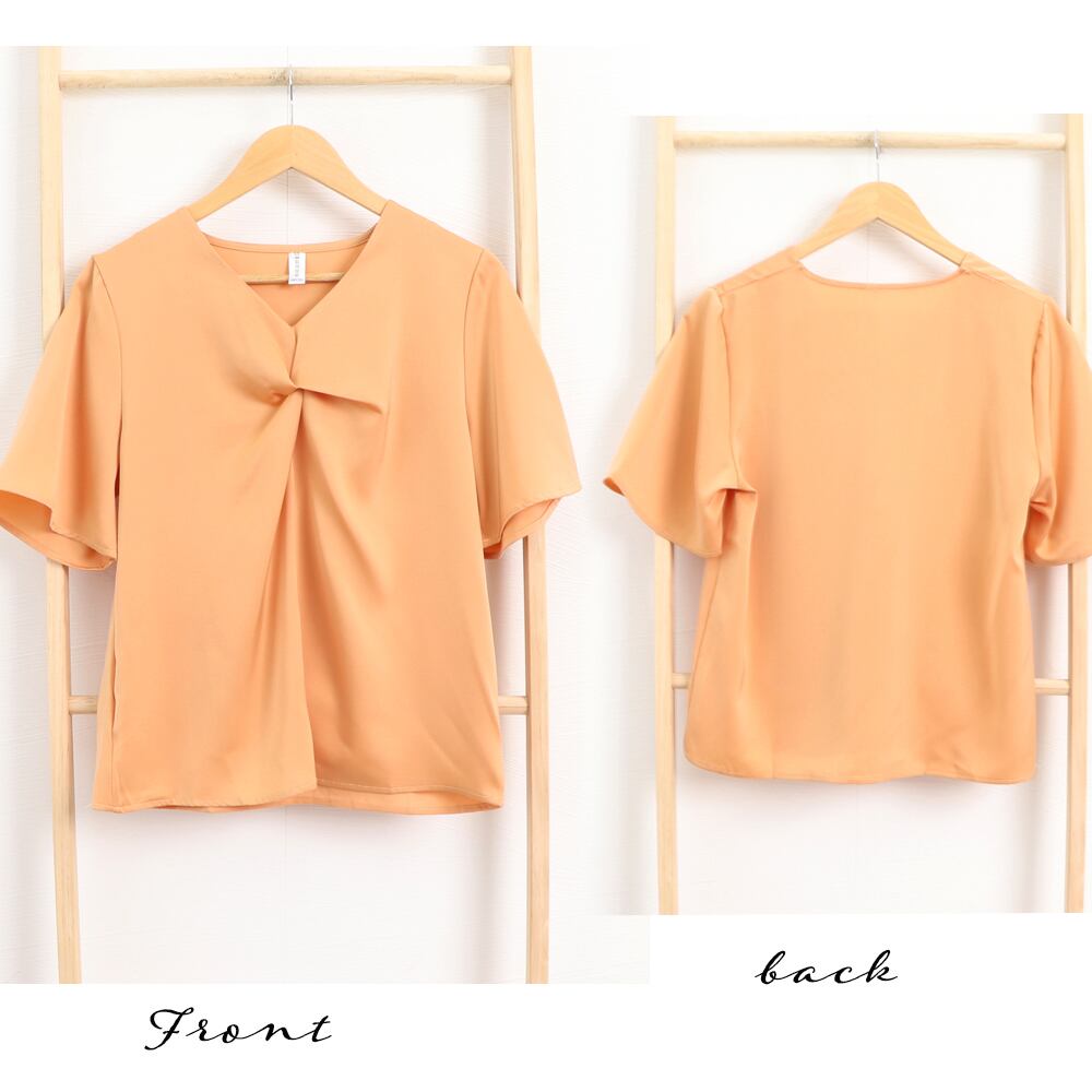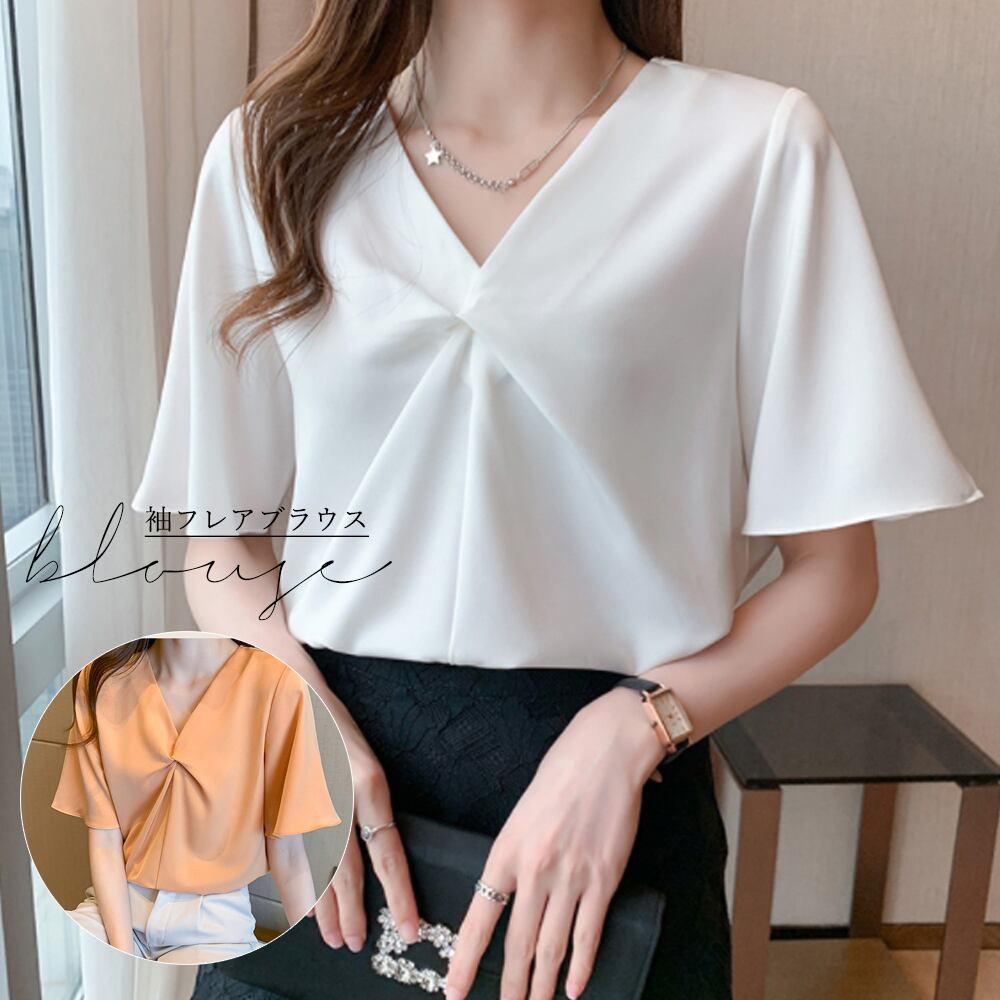 フレア袖 レディース Vネック シフォンブラウス 薄手半袖 ねじり 通勤シャツ 無地 カジュアル トップス 着やせ 春夏