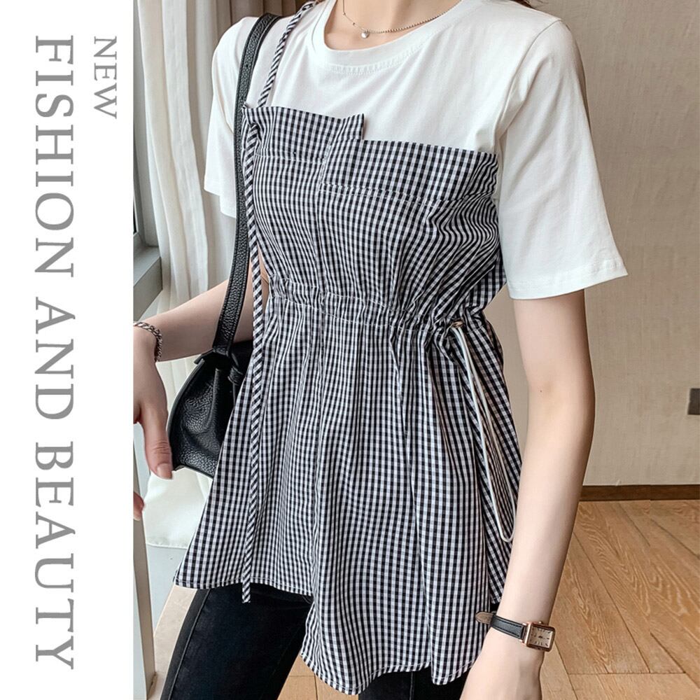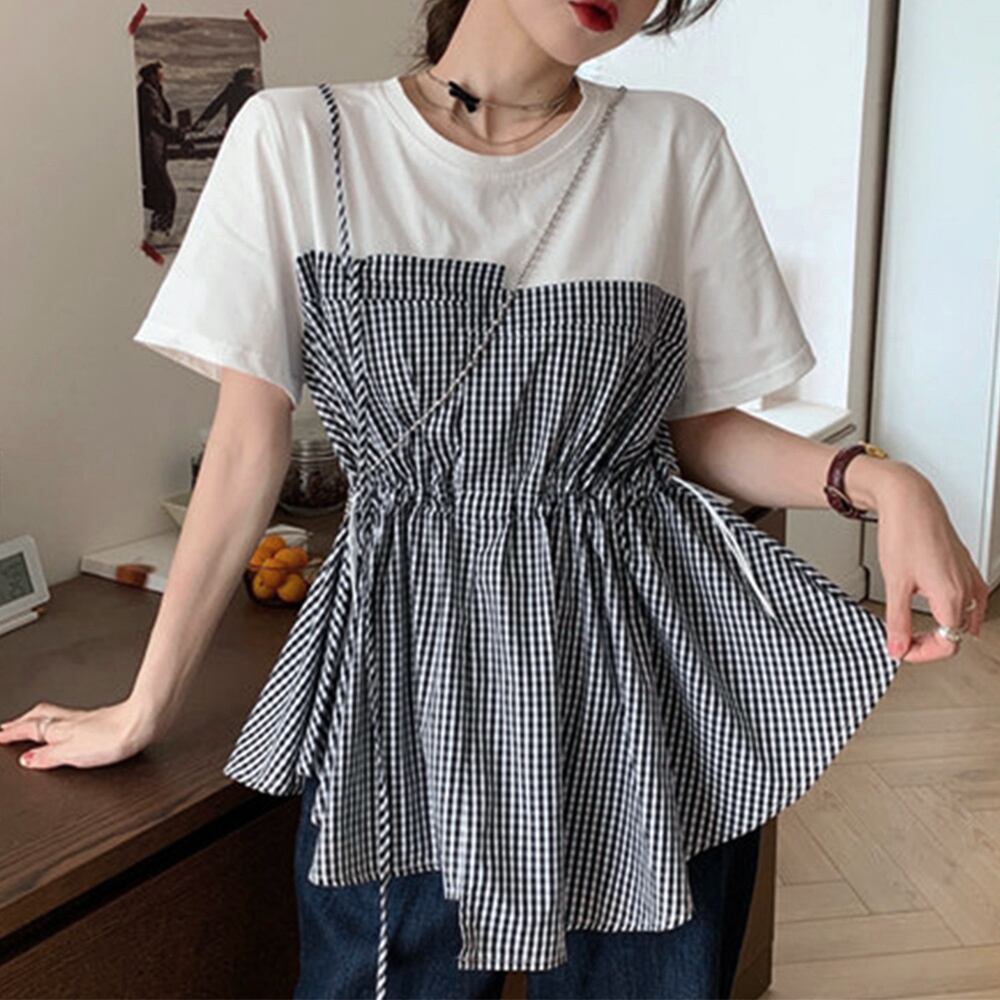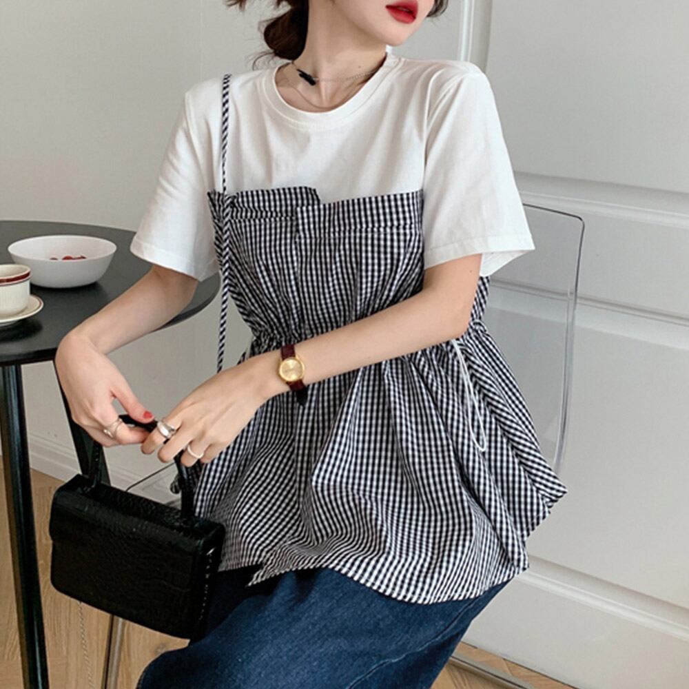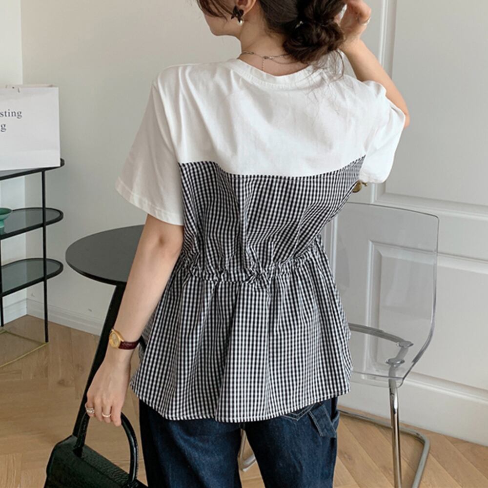 【日本倉庫即納】 異素材切り替えブラウスギンガムチェック柄