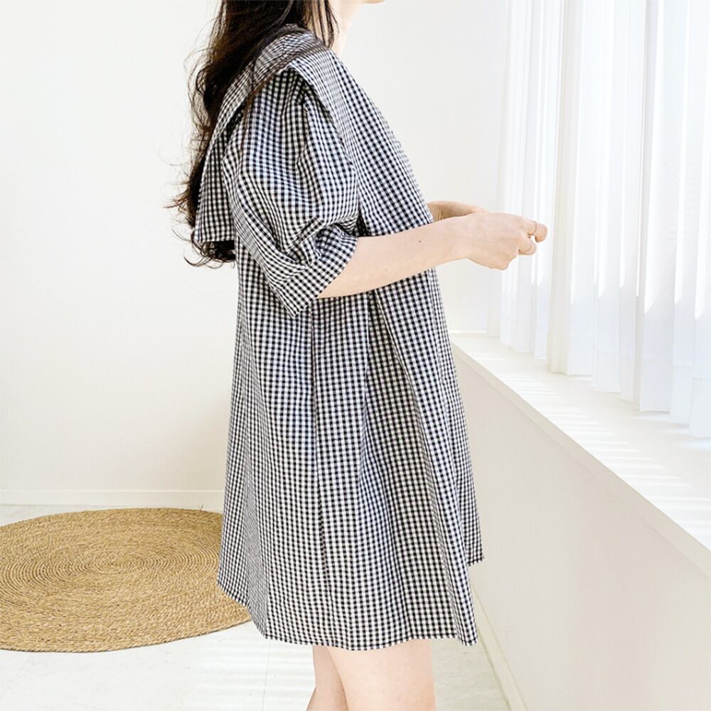 ワンピース 韓国風 ゆったり オーバーサイズ レディース 半袖 体型カバー BIG襟 チェック柄 ボリューム袖 大人上品