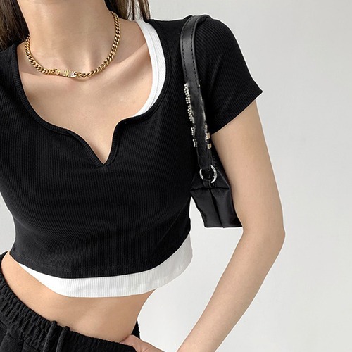 デコルテラインを綺麗に見せてくれるショート丈半袖トップス