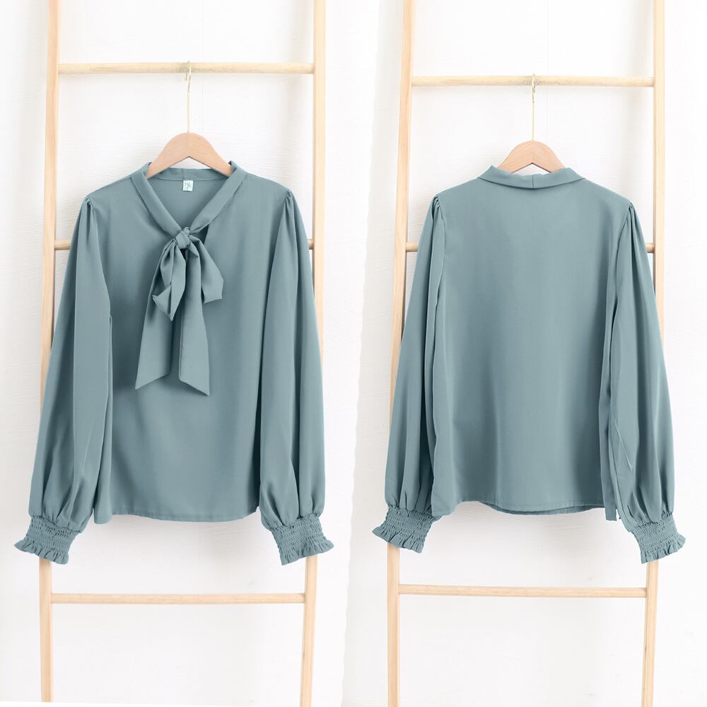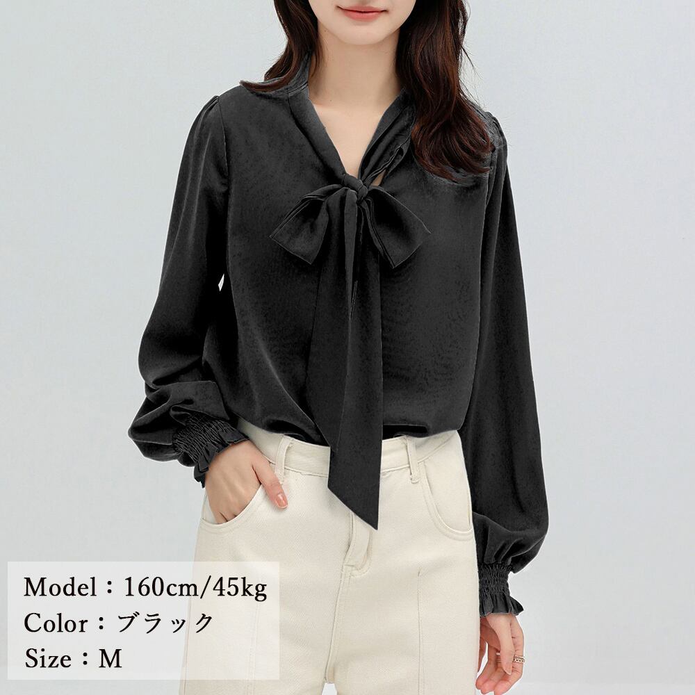 タイリボン 長袖 シャツブラウス タイネック 大人女性 無地 パフスリーブ 通勤 就活 着やせ 韓国 春夏服 きれいめ