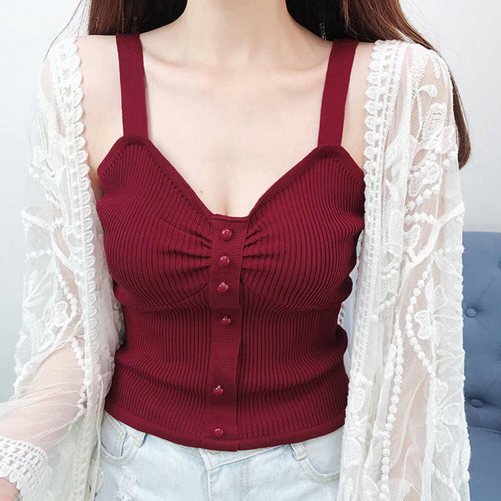 サマーニット フロントボタン vネック タンクトップ 無地 重ね着 インナー ノースリーブ リブニット 着回し