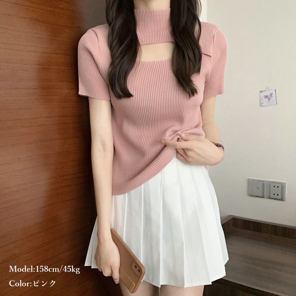 リブニット 着やせ セクシーニットソー 胸見せ 無地 ニットセーター ボトルネック 半袖 ニットトップス きれいめ