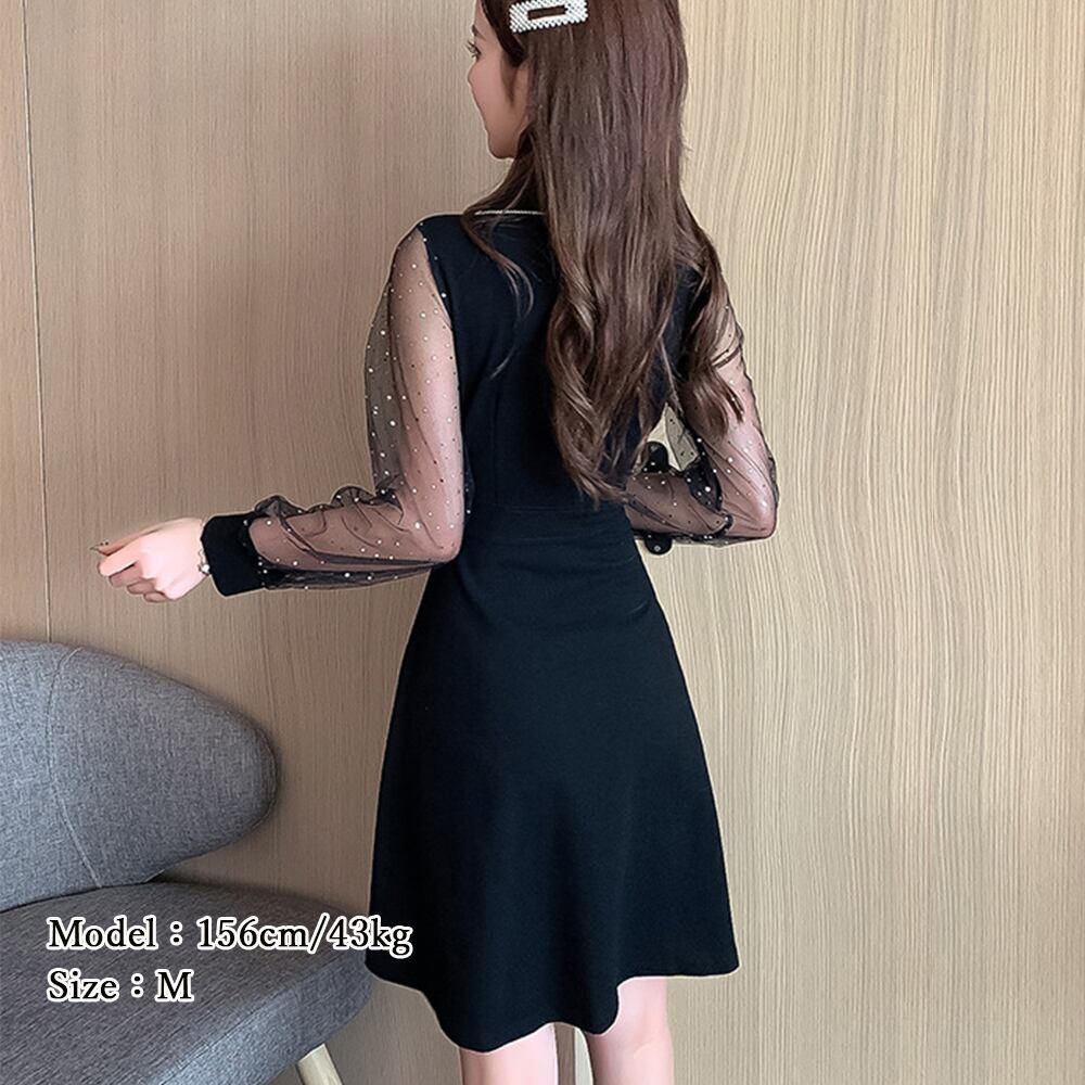 【日本倉庫即納】 ワンピース 黒 チュール袖ミニワンピース