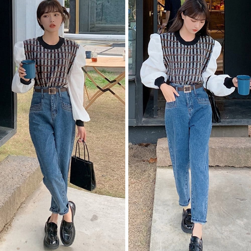 パフスリーブ 長袖 ニットトップス 春秋 チェック柄 ニットソー異素材 プルオーバー ボリュームスリーブ ストリート