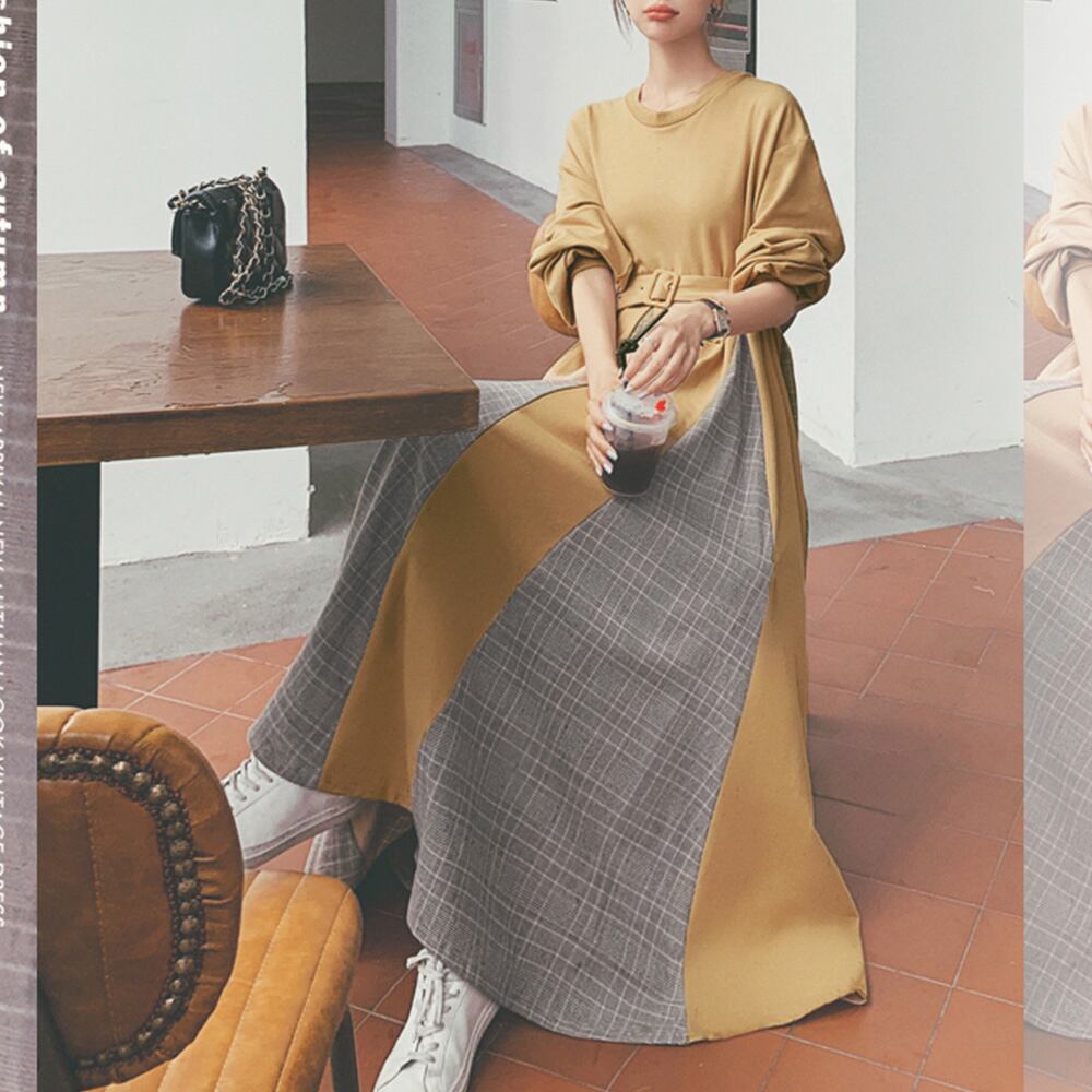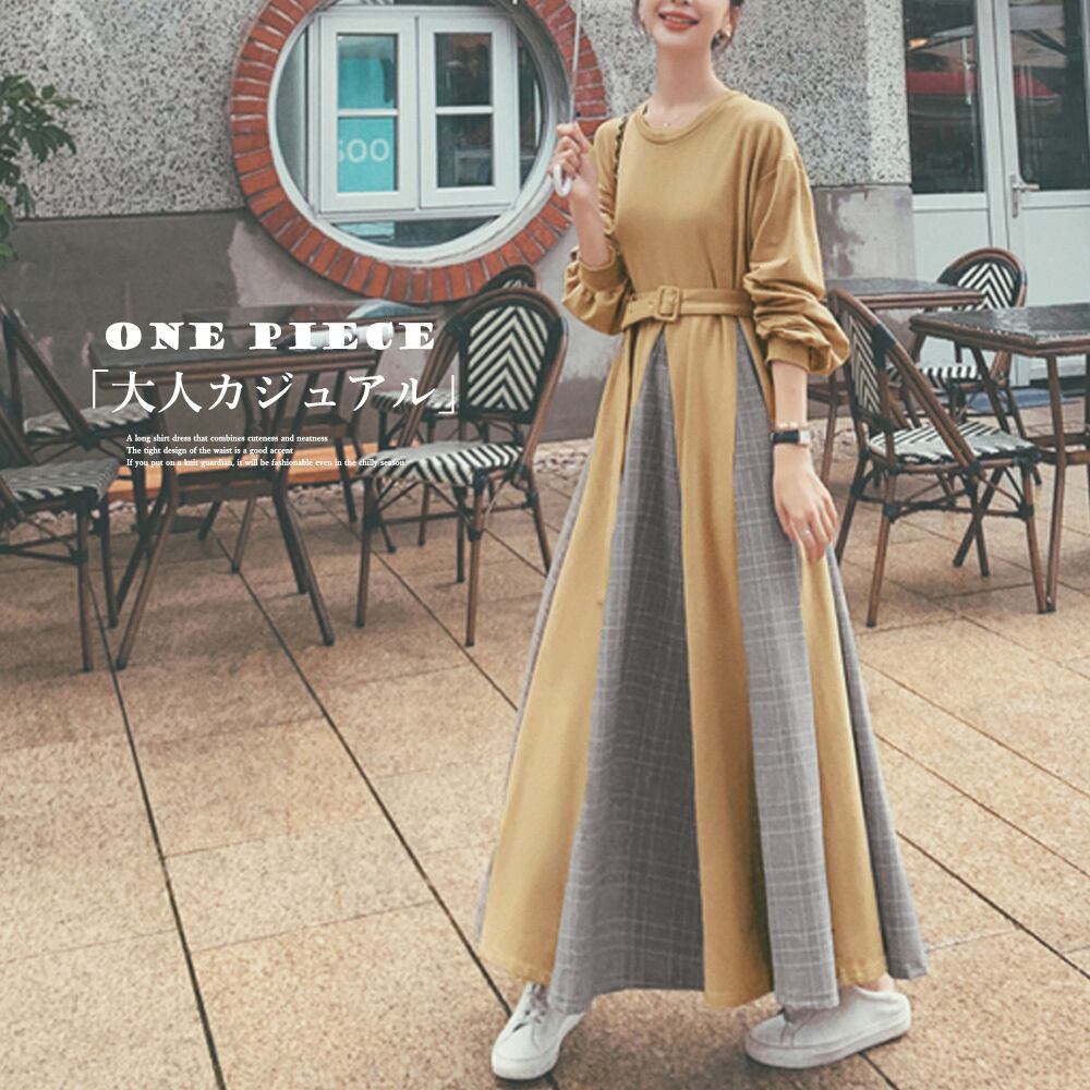 レディース オシャレ Aラインワンピース クルーネック 長袖 ウエストマーク 配色ワンピ 体型カバー 着やせ 大人