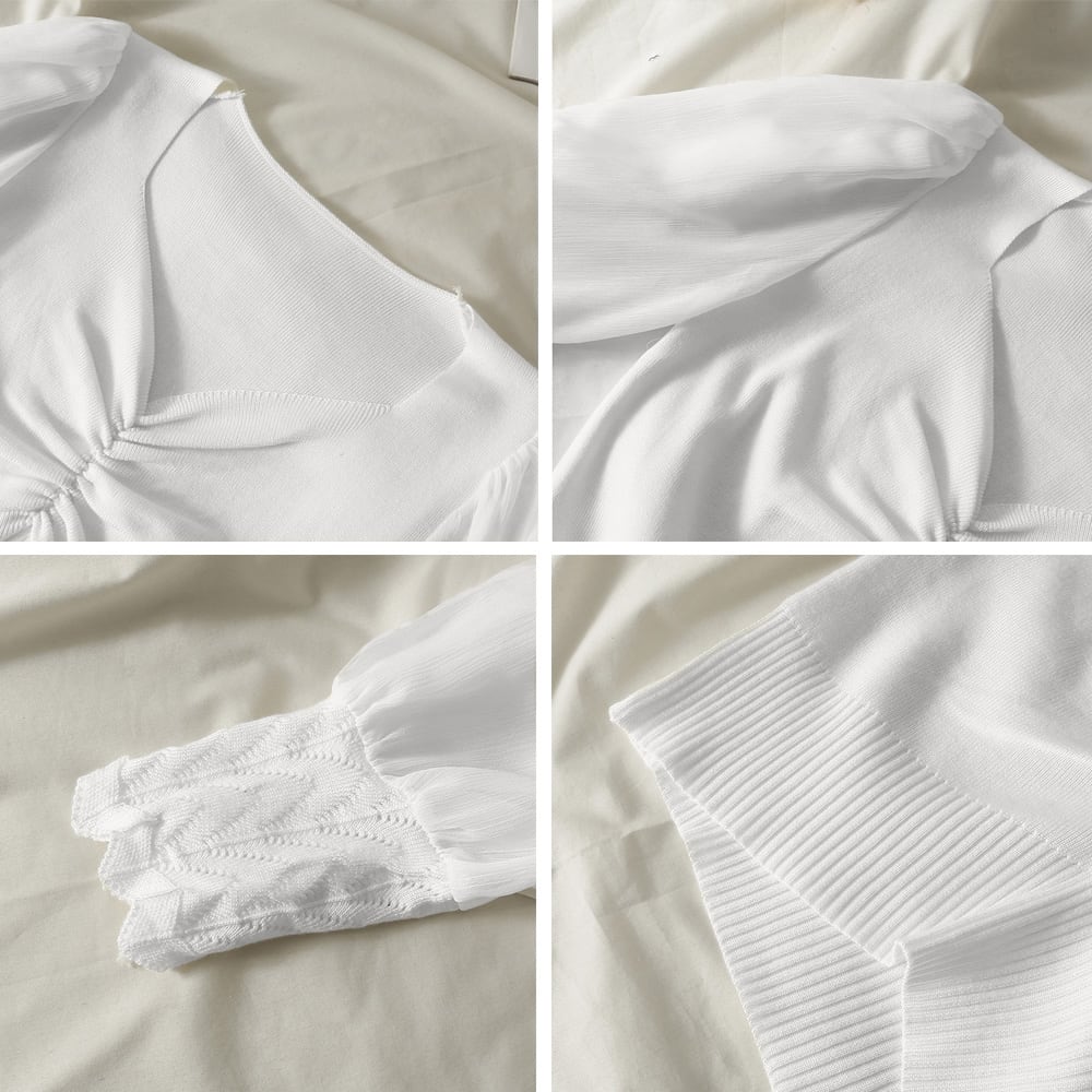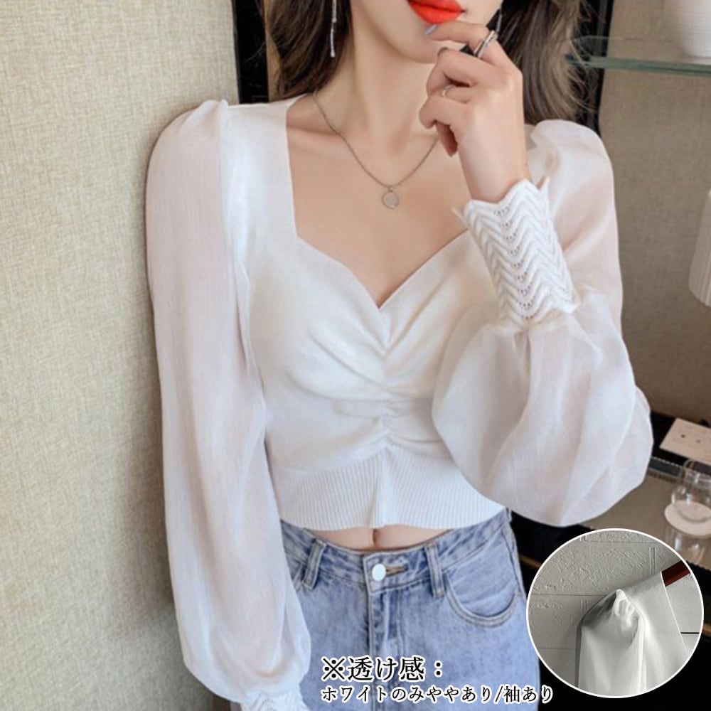 ニットトップス レディース 異素材袖 ドッキングニット ショート丈 韓国風 ブラウス おしゃれ