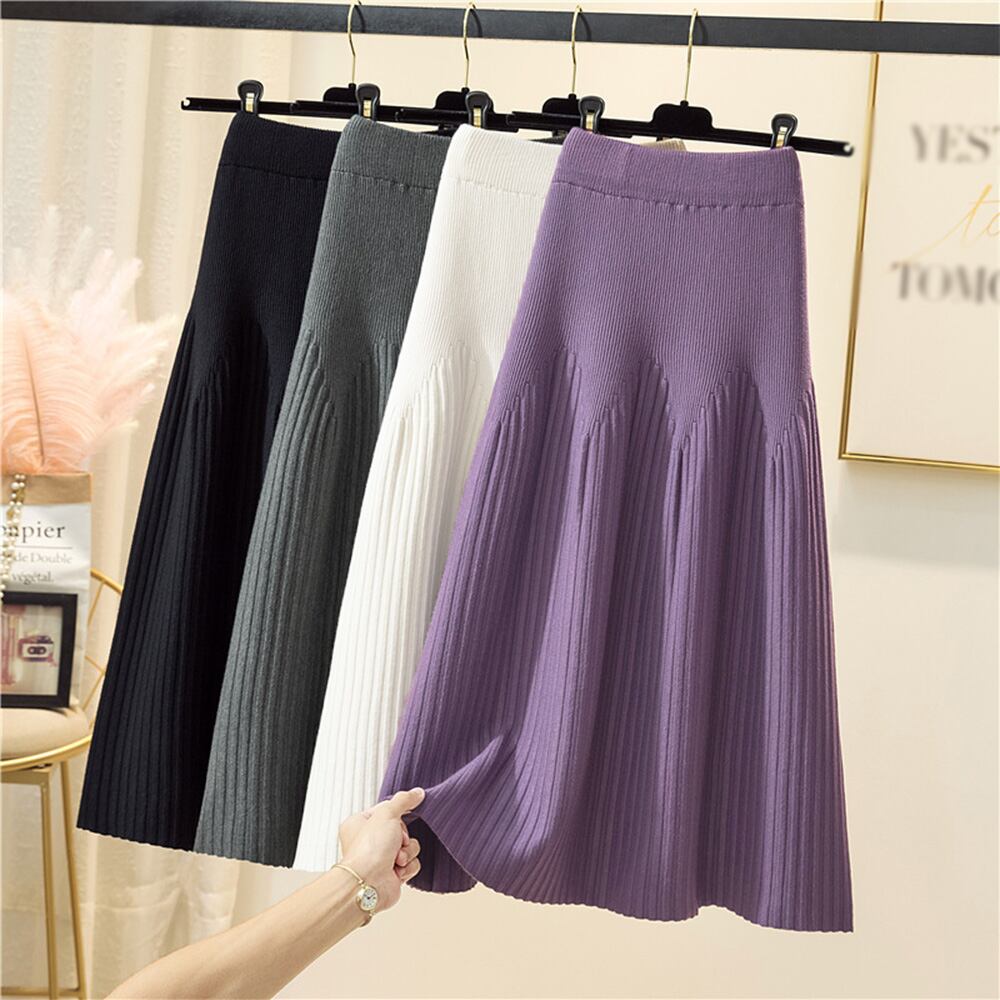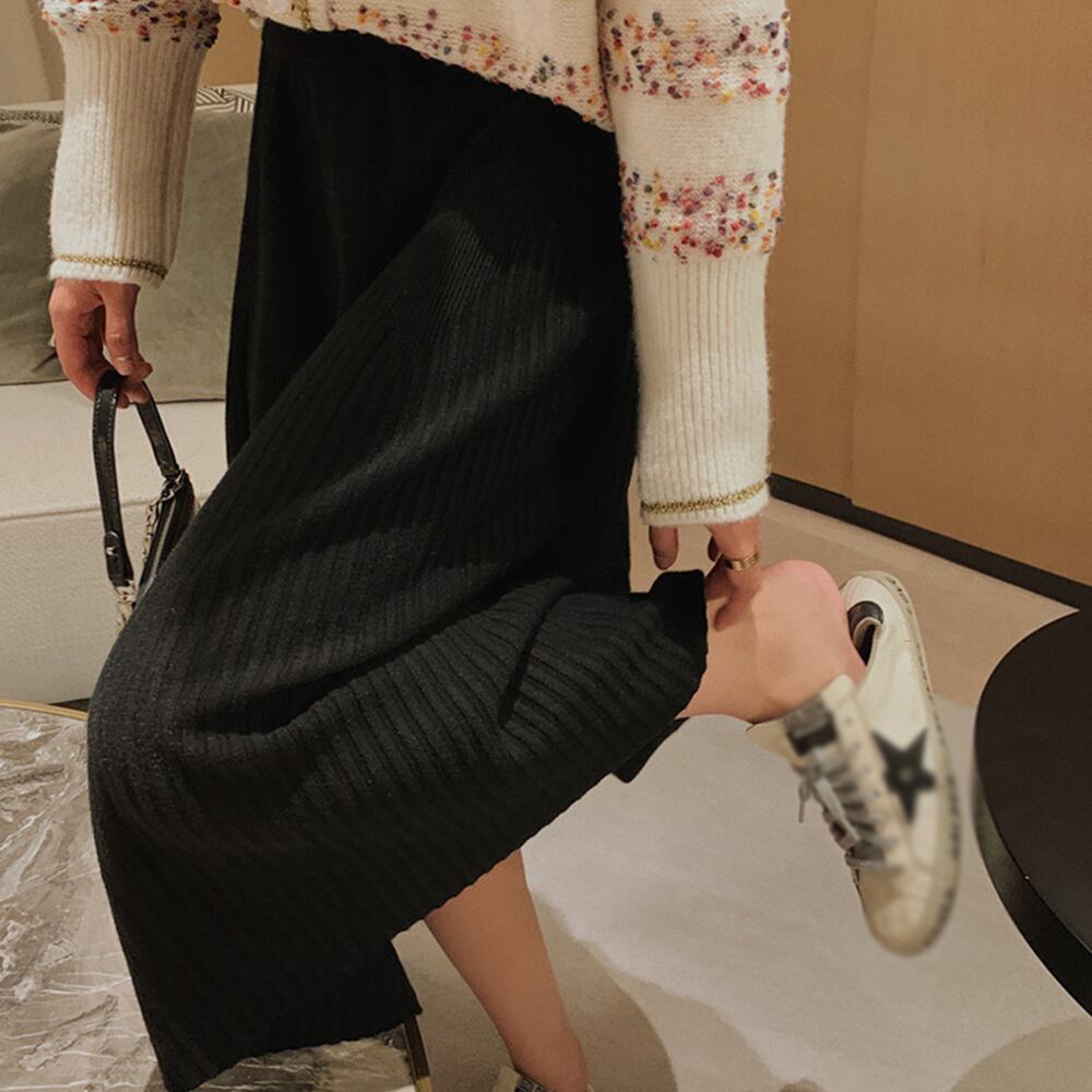しっかりと厚みのあるリブニット素材で暖かいミモレ丈スカートです