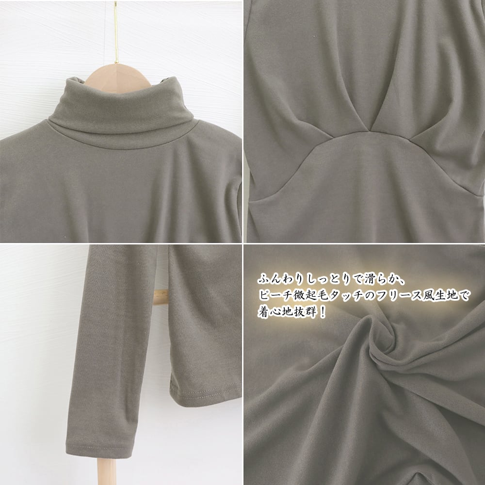 ふんわりしっとりで滑らか、ピーチ微起毛タッチのフリース風生地で着心地抜群のタートルネックトップス