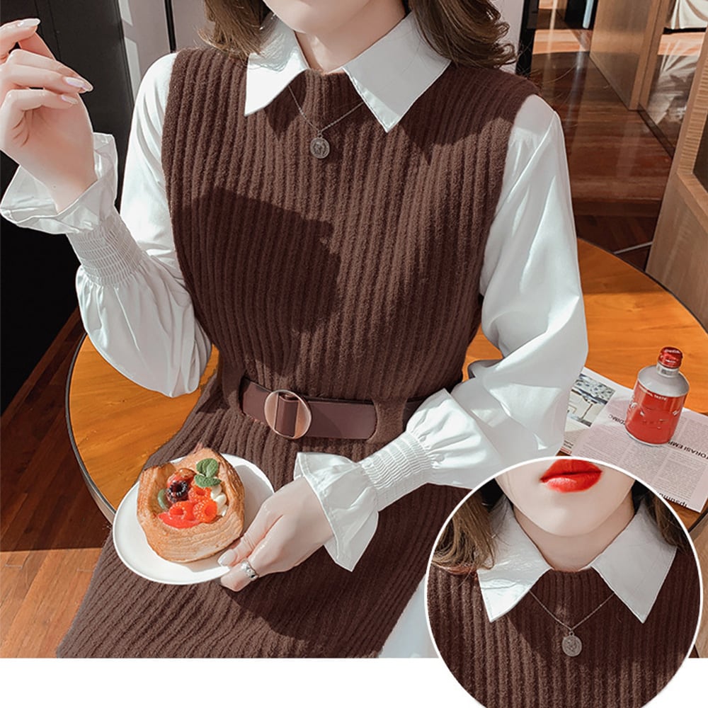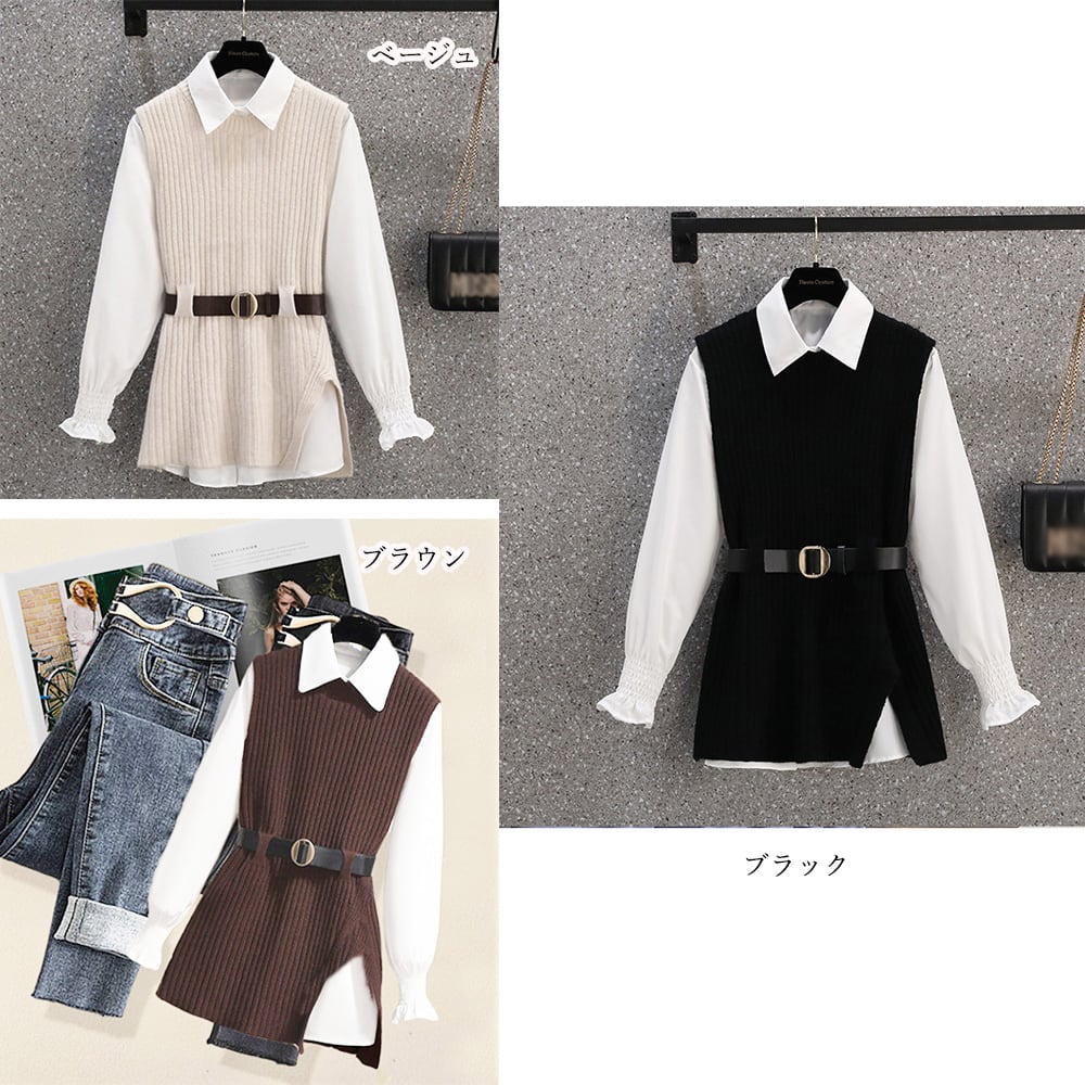 ニットベスト レディース ベルト付き シャーリング袖ブラウス セーター スリット入り 無地 女子会 長袖