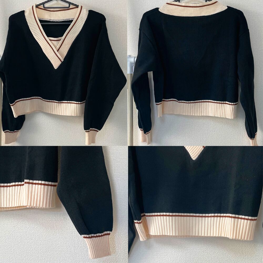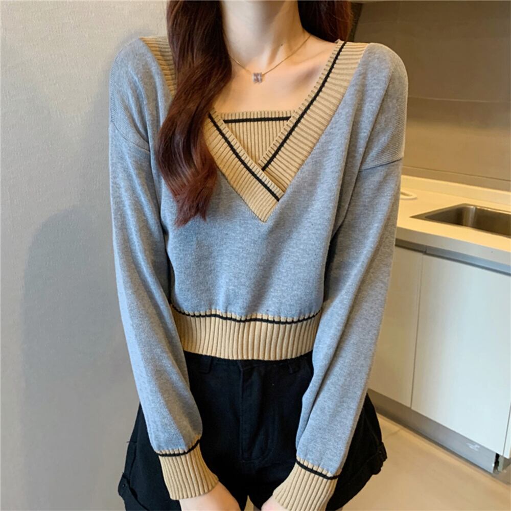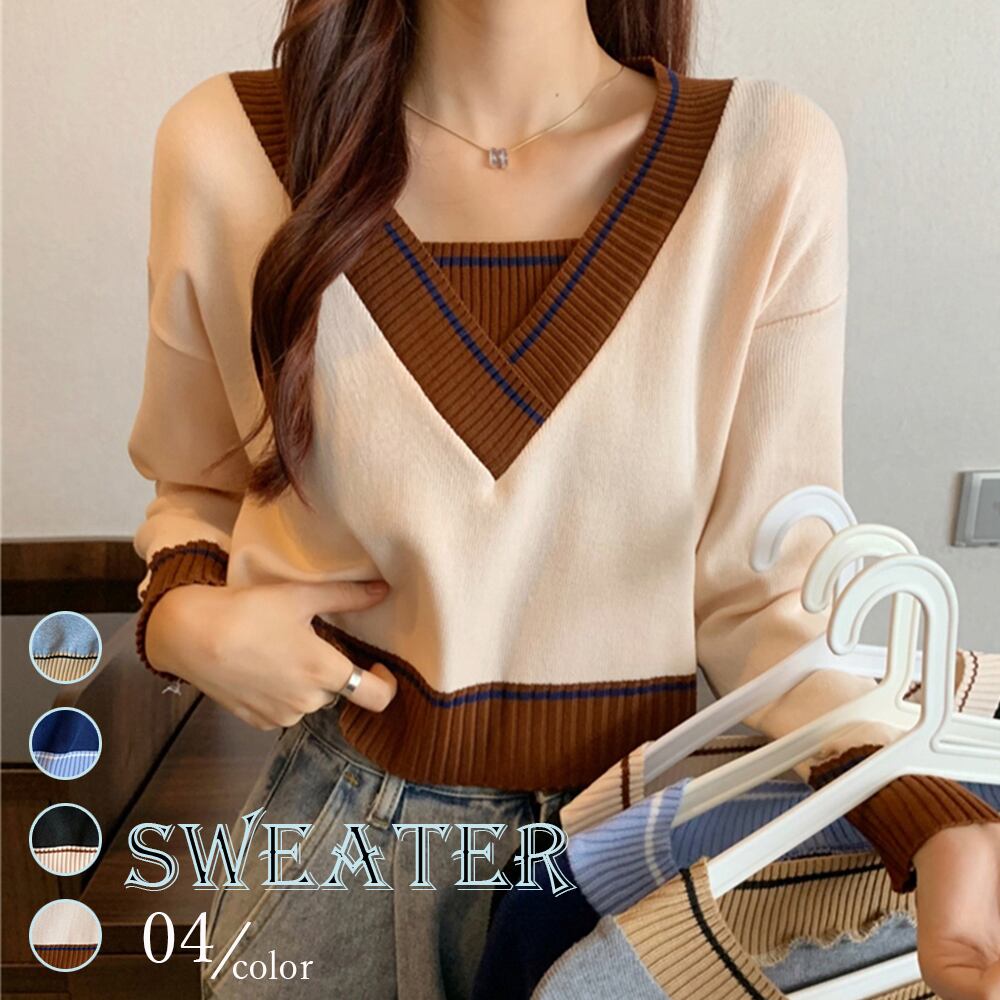 レディース ショート丈 トップス 長袖 ニットセーター カジュアル Vネック 春秋 ニットソー