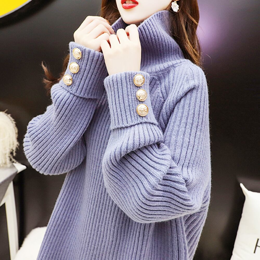 ニットトップス レディース ハイネック あったか セーター 冬 スリット入り 無地 女子会 長袖 ボタン飾り
