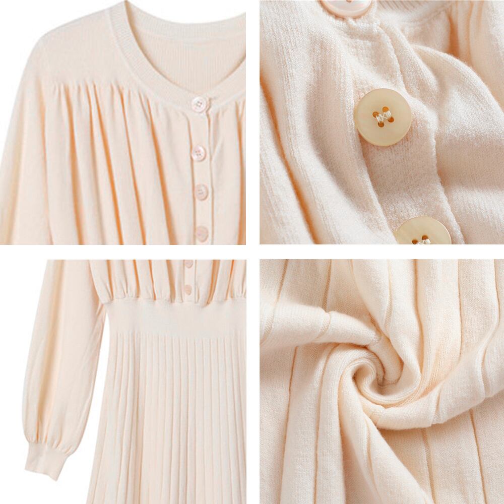 ミモレ丈ワンピース クルーネック 長袖 パフスリーブドレス エレガント 秋冬通勤 大人 ハイウエスト ワンピース 無地