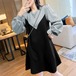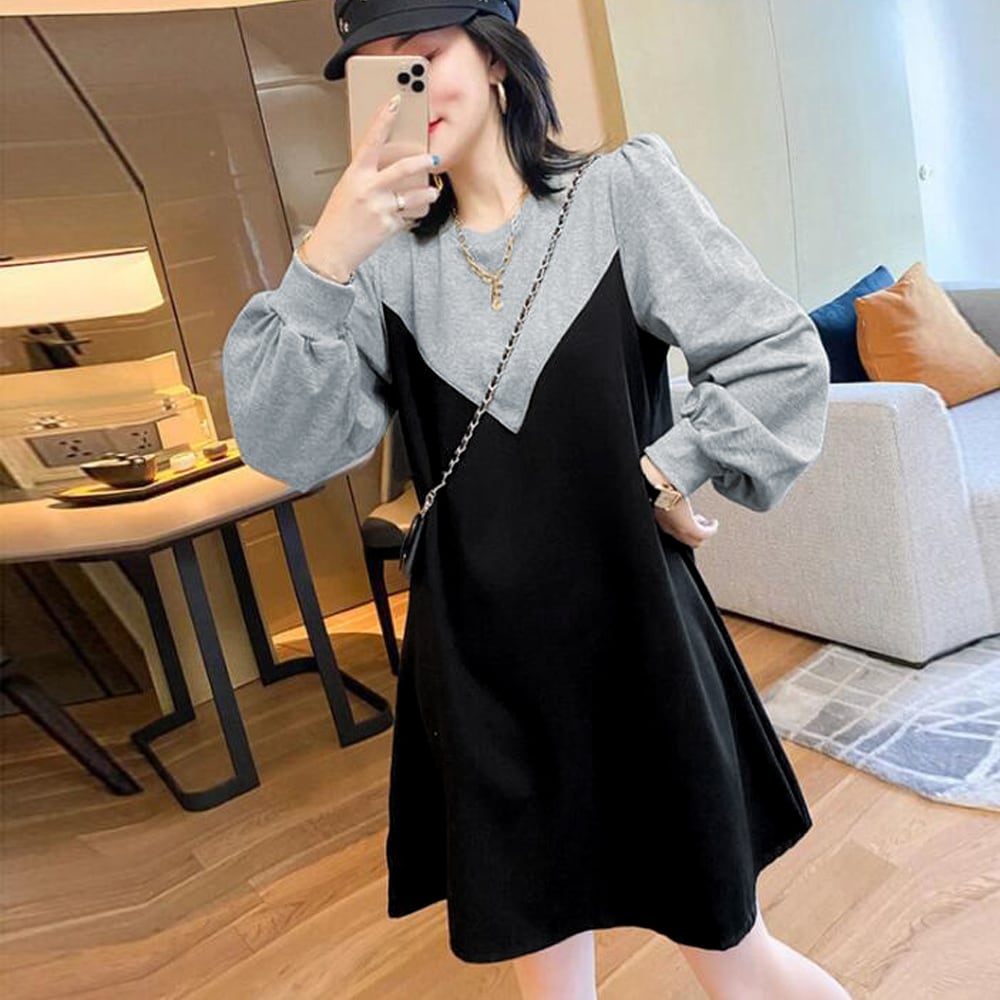 レディース 長袖 重ね着風 春秋冬 異素材 ゆったりAラインワンピース カジュアル ショート丈 マタニティウェア